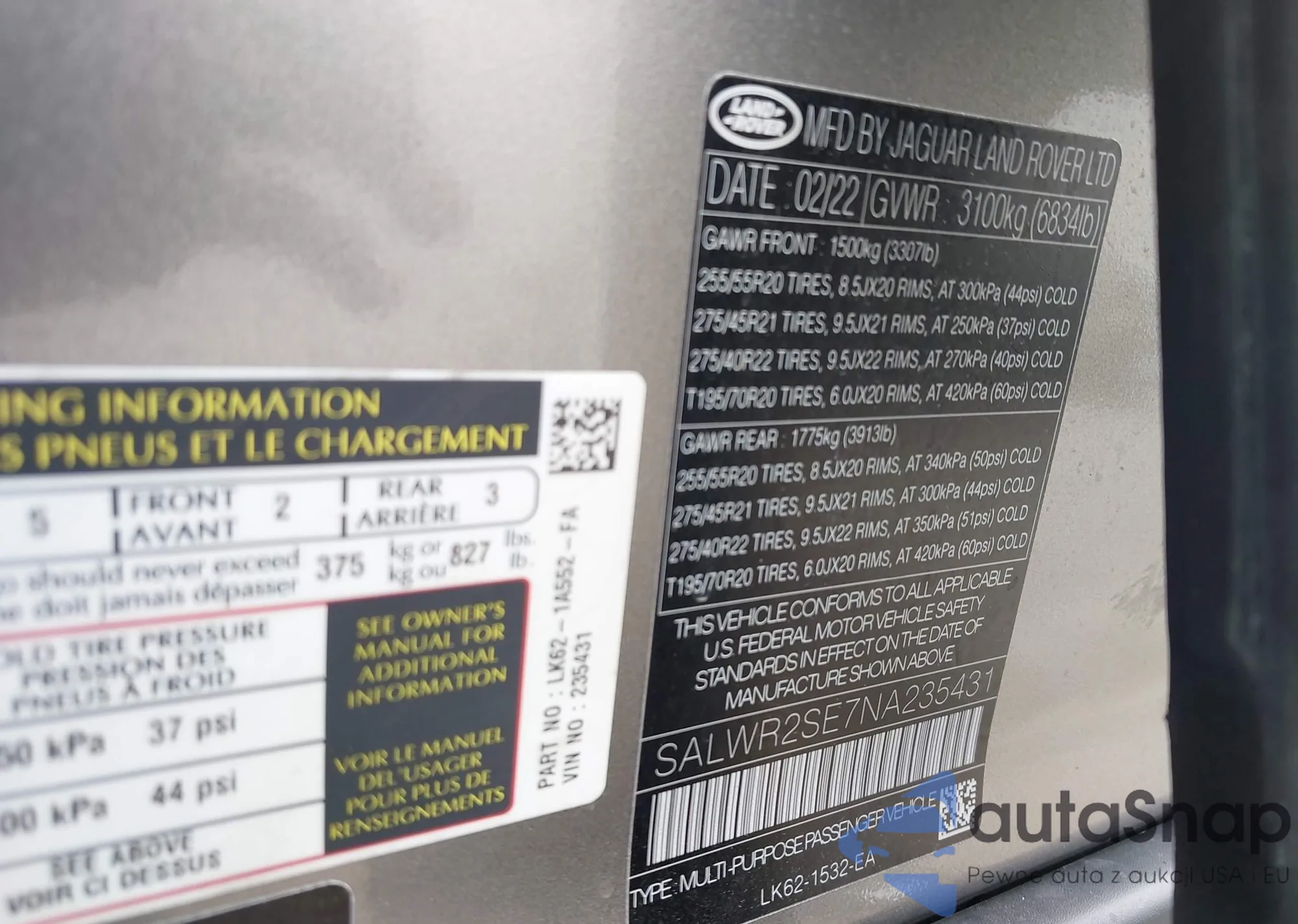 The car Land Rover Range Rover Sport 2022 (VIN SALWR2SE7NA235431) has not been auctioned before. The documents are clean, and the mileage matches or is below the market average. Sold by an insurance company – we recommend purchase. Delivery to the port will take approx. 6–8 weeks.