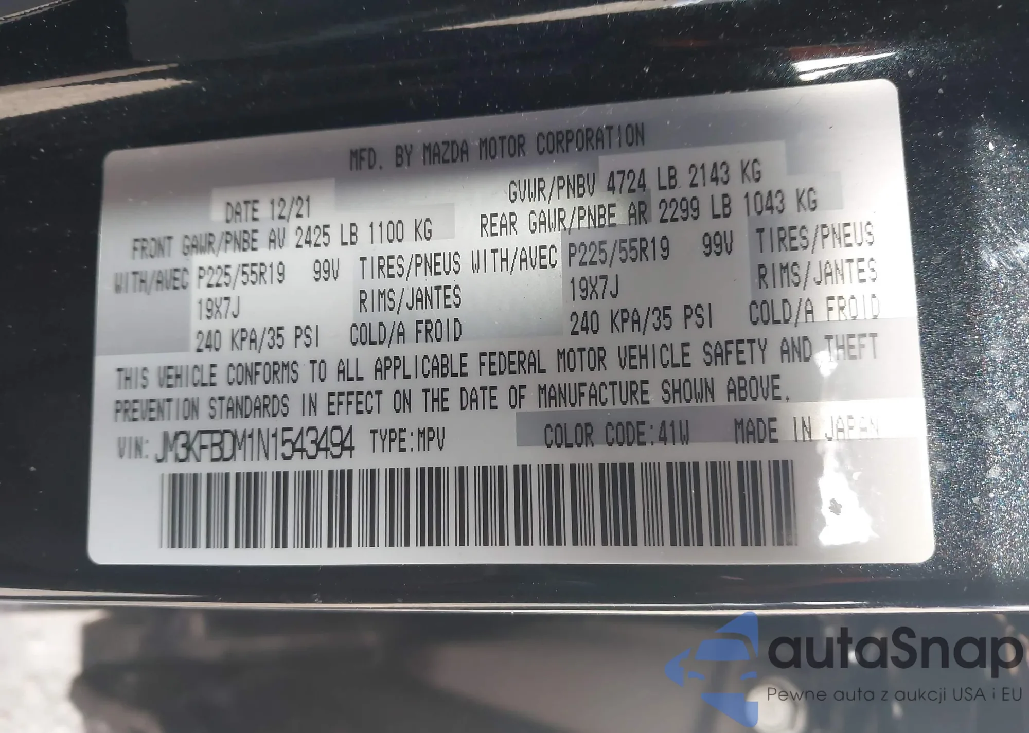 The car Mazda CX-5 2022 (VIN JM3KFBDM1N1543494) has not been auctioned before. The documents are clean, and the mileage matches or is below the market average. Sold by an insurance company – we recommend purchase. Delivery to the port will take approx. 6–8 weeks.