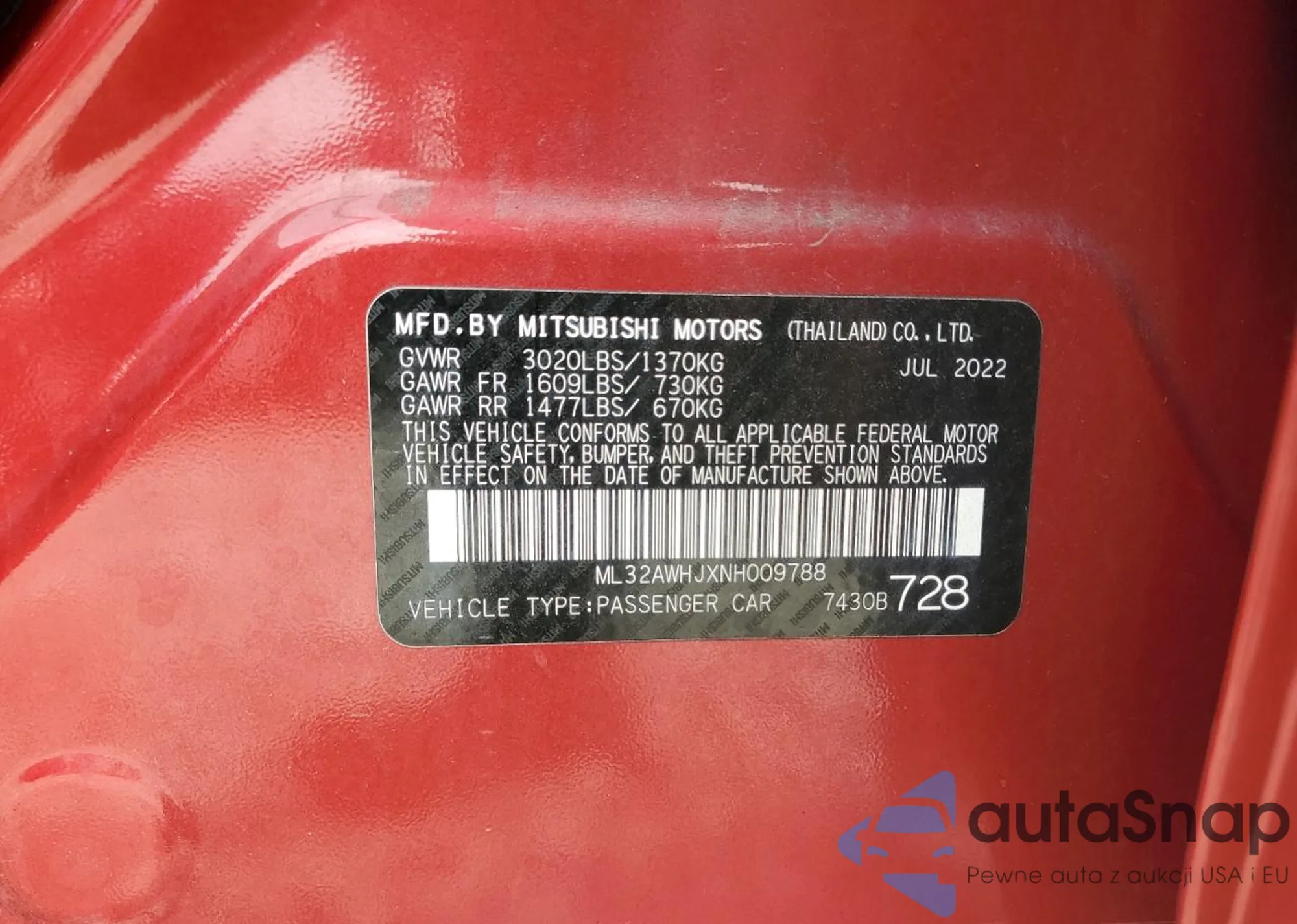 The car Mitsubishi Mirage 2022 (VIN ML32AWHJXNH009788) has documents that prevent registration. Export and registration may be difficult. Contact AutaSnap experts to find alternatives.