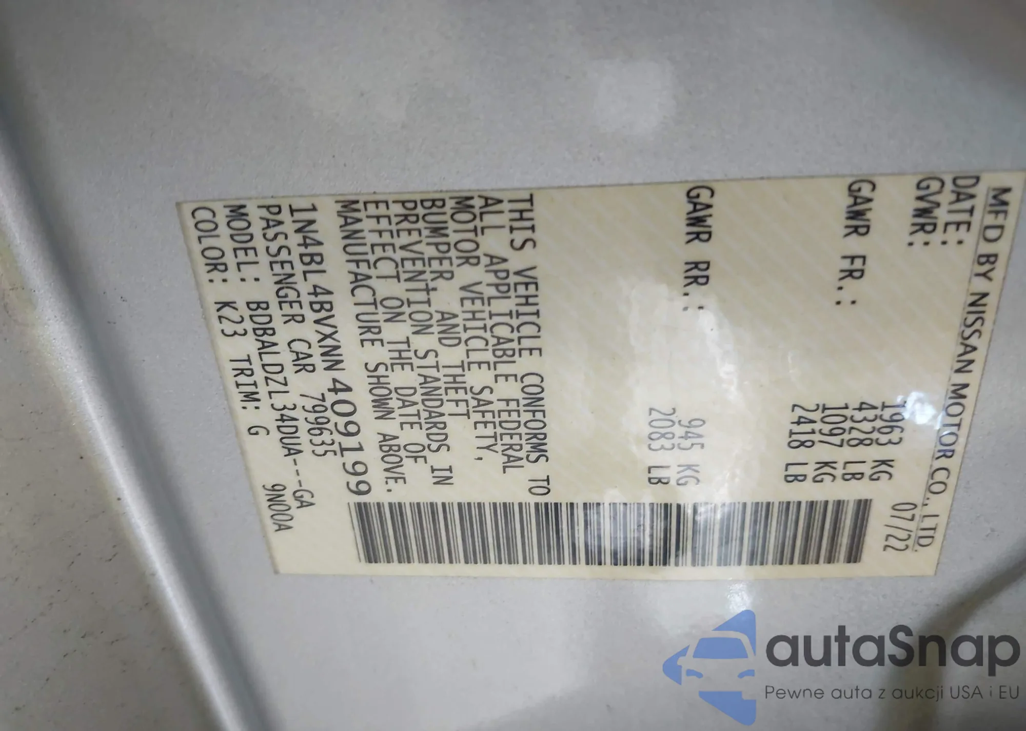 VIN: 1N4BL4BVXNN409199