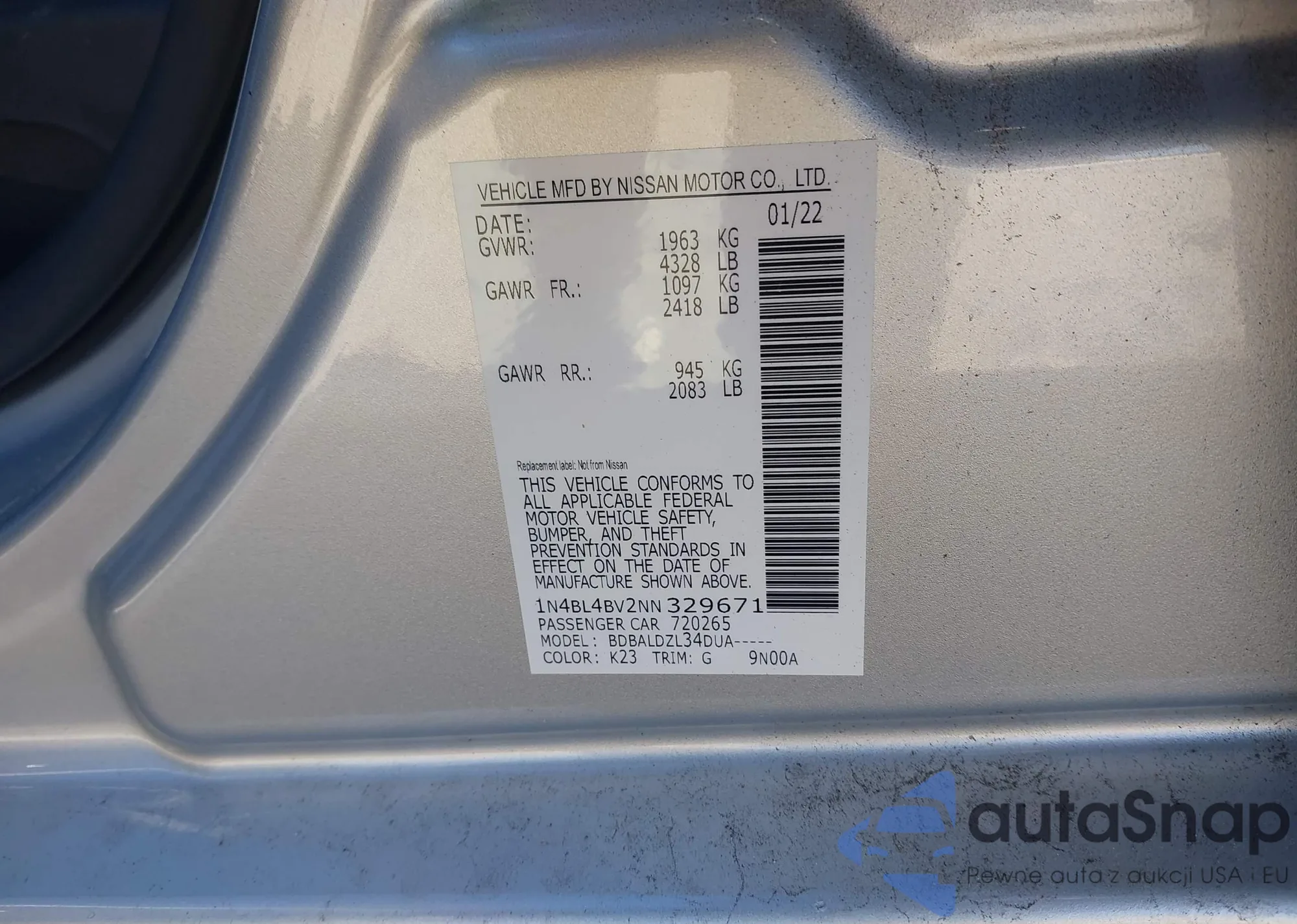 The car Nissan Altima 2022 (VIN 1N4BL4BV2NN329671) has not been auctioned before. The documents are clean, and the mileage matches or is below the market average. Sold by an insurance company – we recommend purchase. Delivery to the port will take approx. 6–8 weeks.
