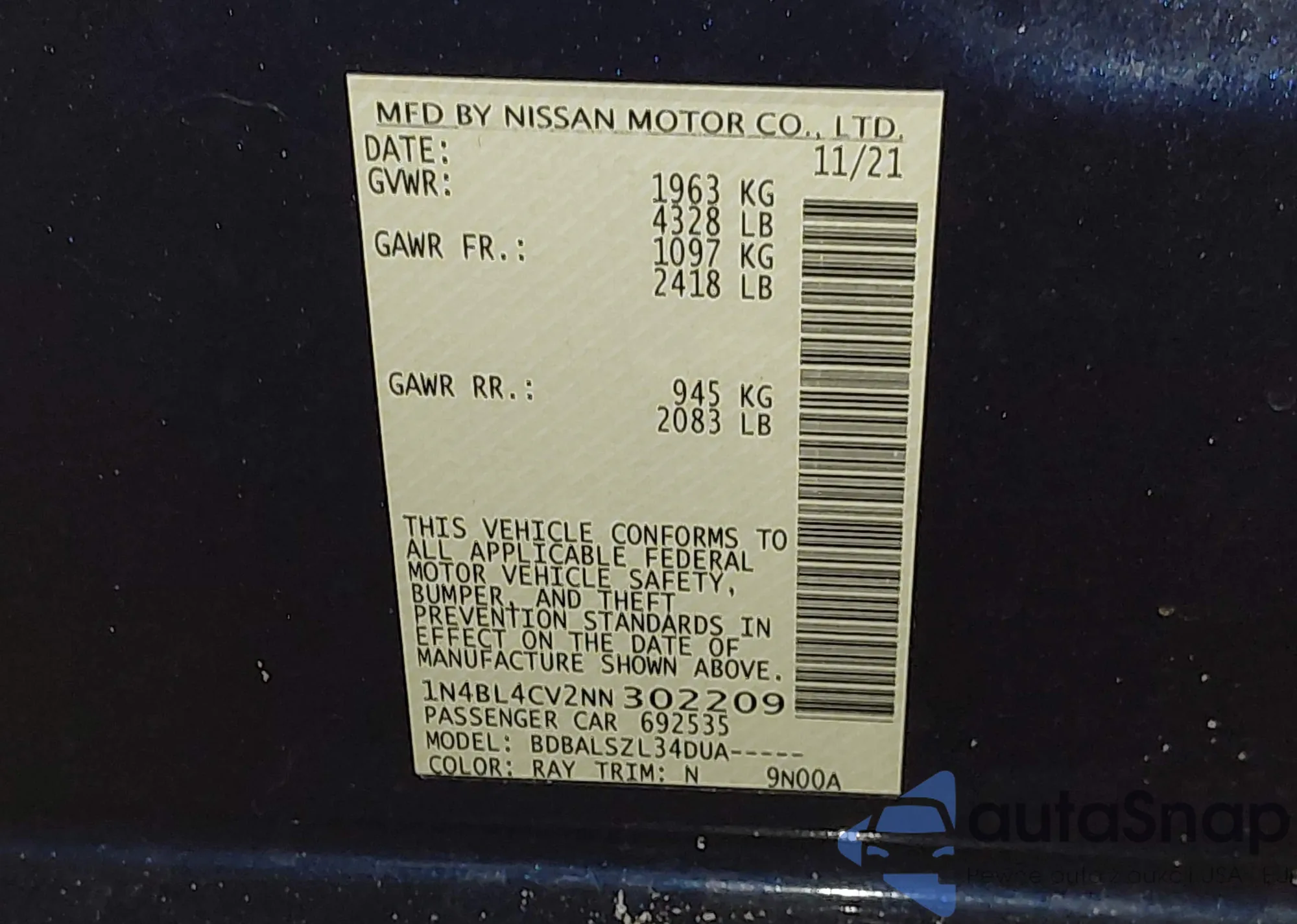 VIN: 1N4BL4CV2NN302209