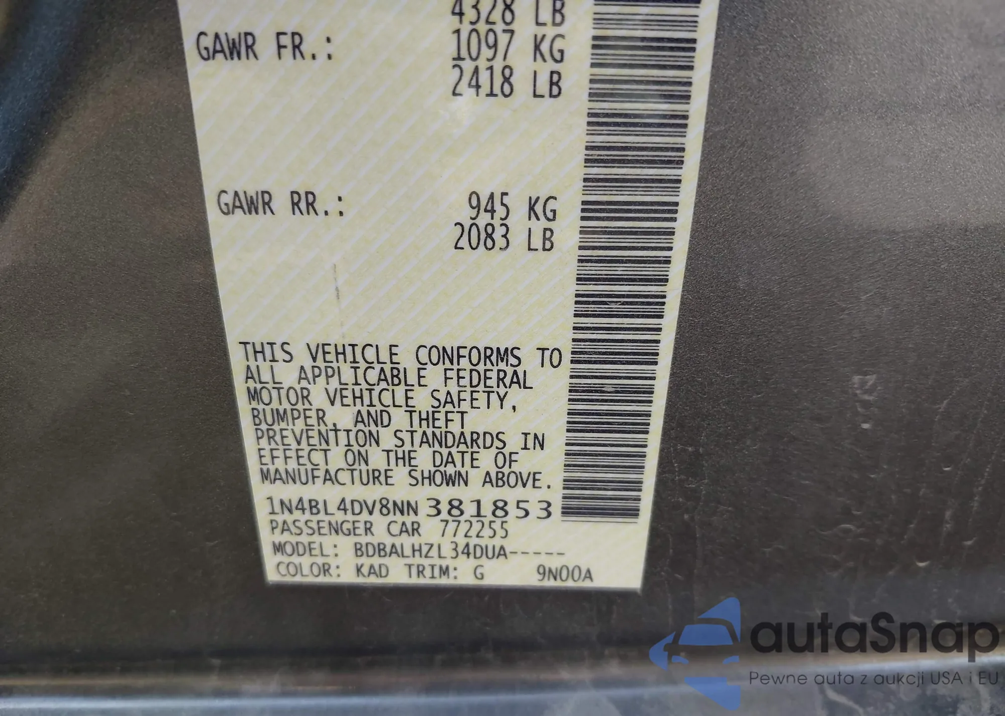 VIN: 1N4BL4DV8NN381853