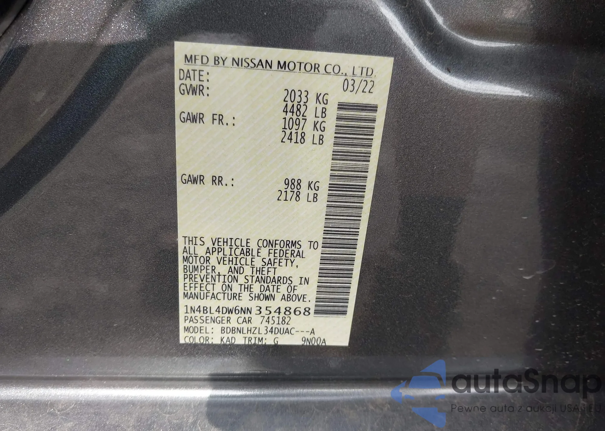 VIN: 1N4BL4DW6NN354868