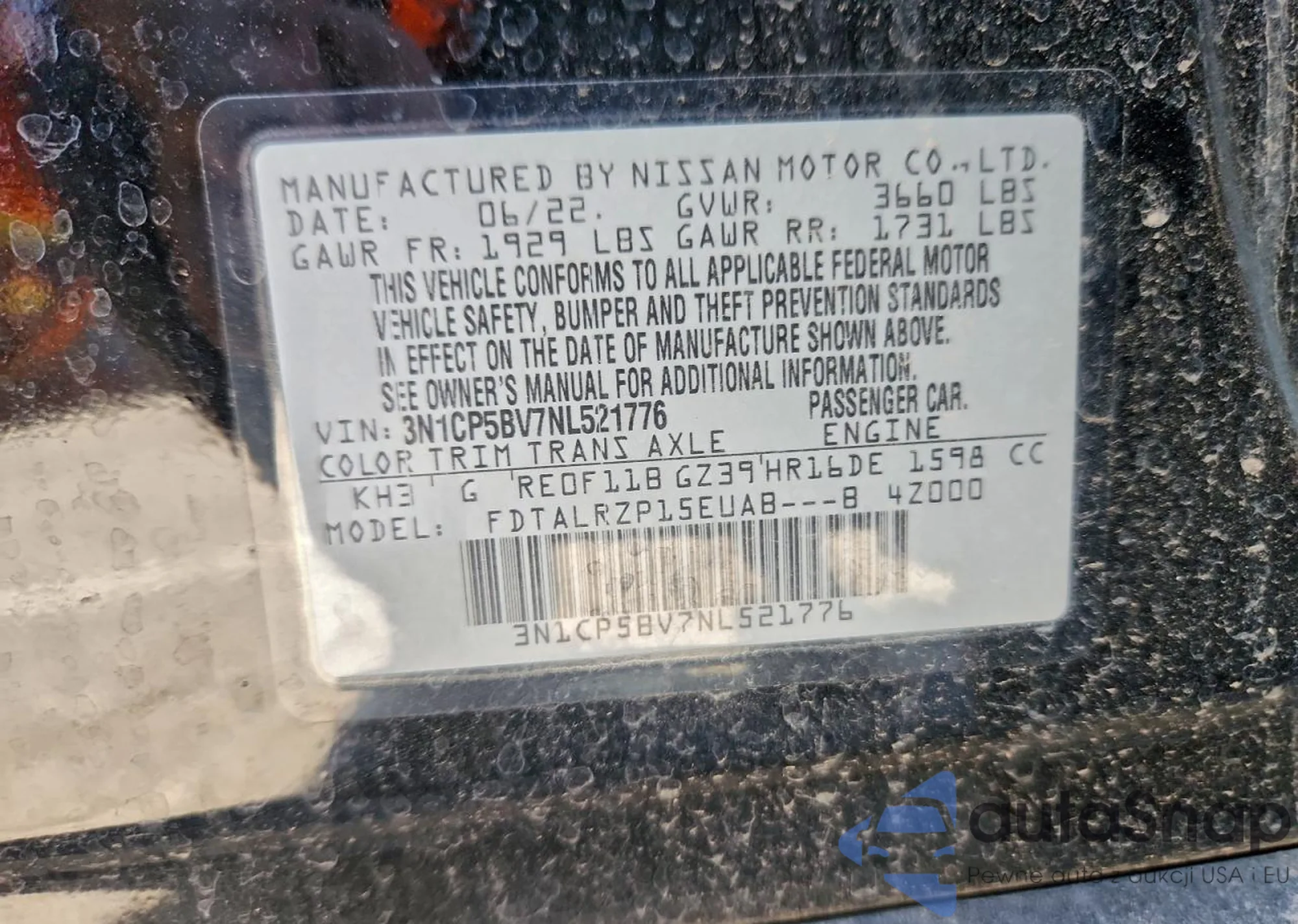 The car Nissan Kicks 2022 (VIN 3N1CP5BV7NL521776) has not been auctioned before. The documents are clean, and the mileage matches or is below the market average. Sold by an insurance company – we recommend purchase. Delivery to the port will take approx. 6–8 weeks.