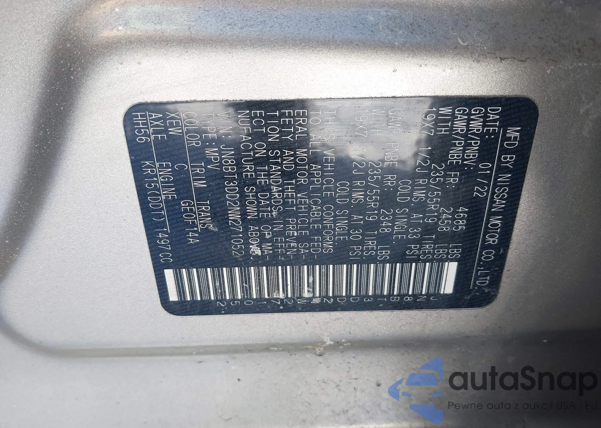 The car Nissan Rogue 2022 (VIN JN8BT3DD2NW271052) has not been auctioned before. The documents are clean, and the mileage matches or is below the market average. Sold by an insurance company – we recommend purchase. Delivery to the port will take approx. 6–8 weeks.