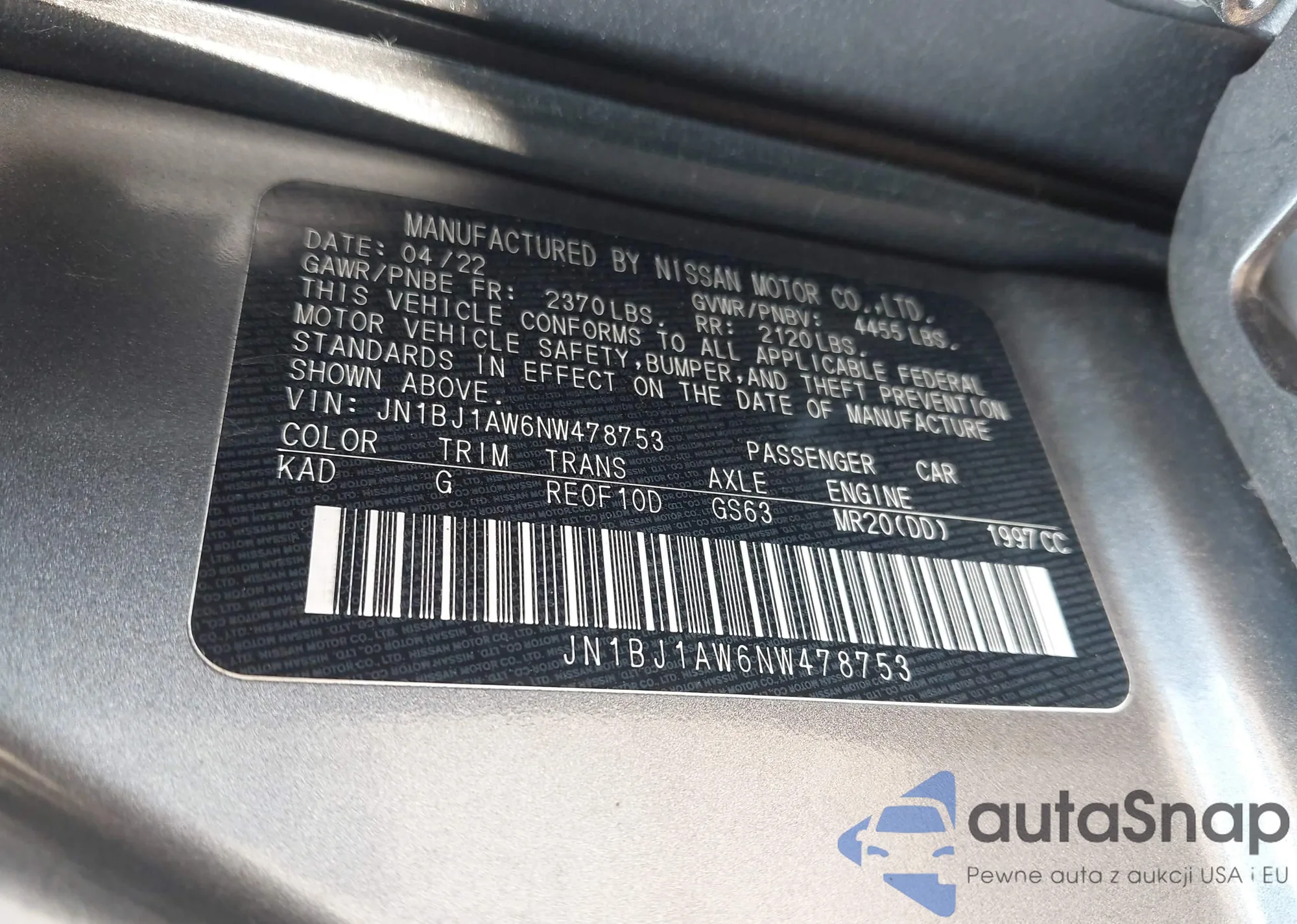 The car Nissan Rogue 2022 (VIN JN1BJ1AW6NW478753) has documents that prevent registration. Export and registration may be difficult. Contact AutaSnap experts to find alternatives.
