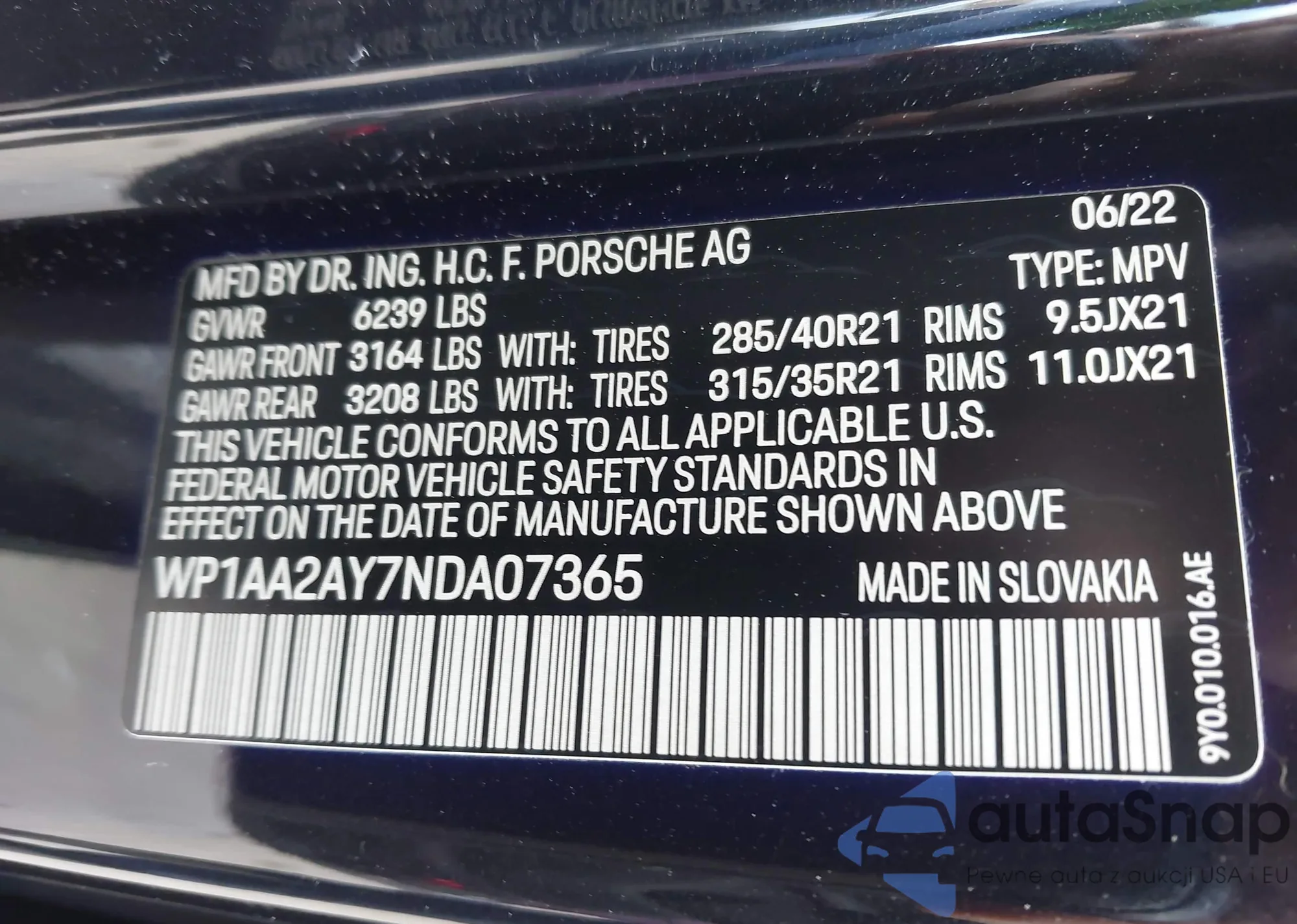The car Porsche Cayenne 2022 (VIN WP1AA2AY7NDA07365) has not been auctioned before. The documents are clean, and the mileage matches or is below the market average. Sold by an insurance company – we recommend purchase. Delivery to the port will take approx. 6–8 weeks.