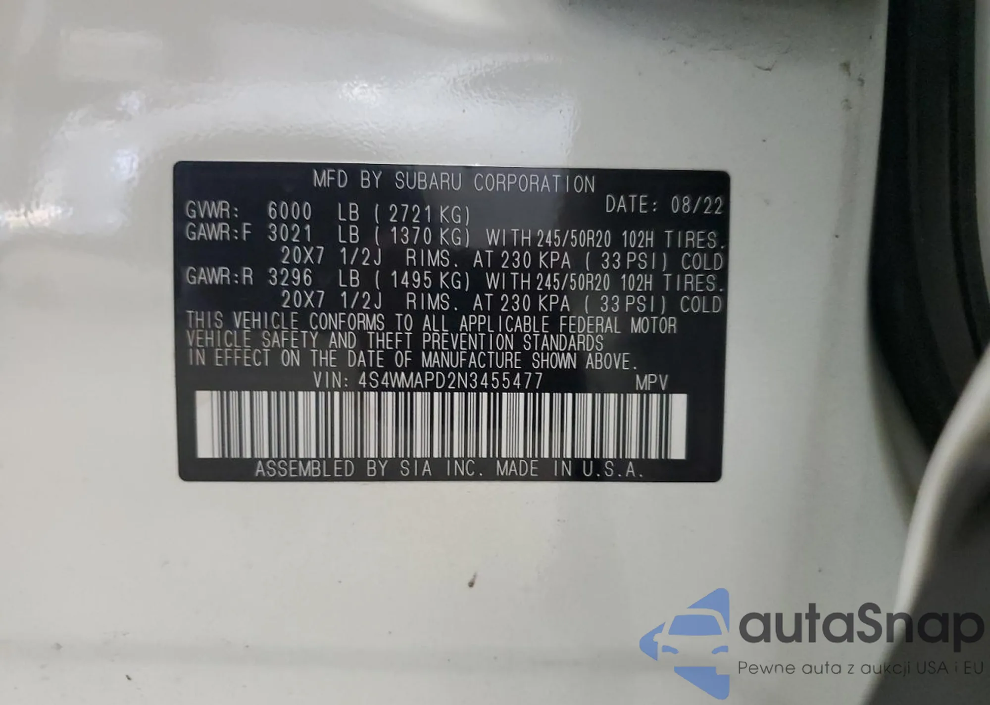 The car Subaru Ascent 2022 (VIN 4S4WMAPD2N3455477) is sold by an unverified seller. We recommend checking the Carfax report and confirming registration possibilities before purchase.
