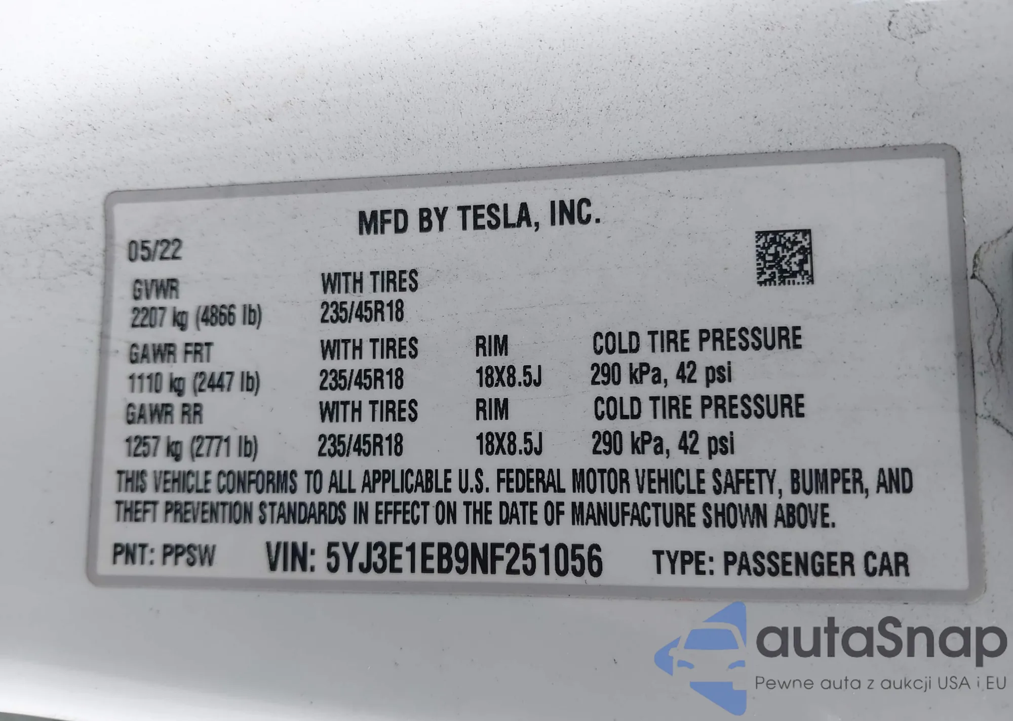 VIN: 5YJ3E1EB9NF251056