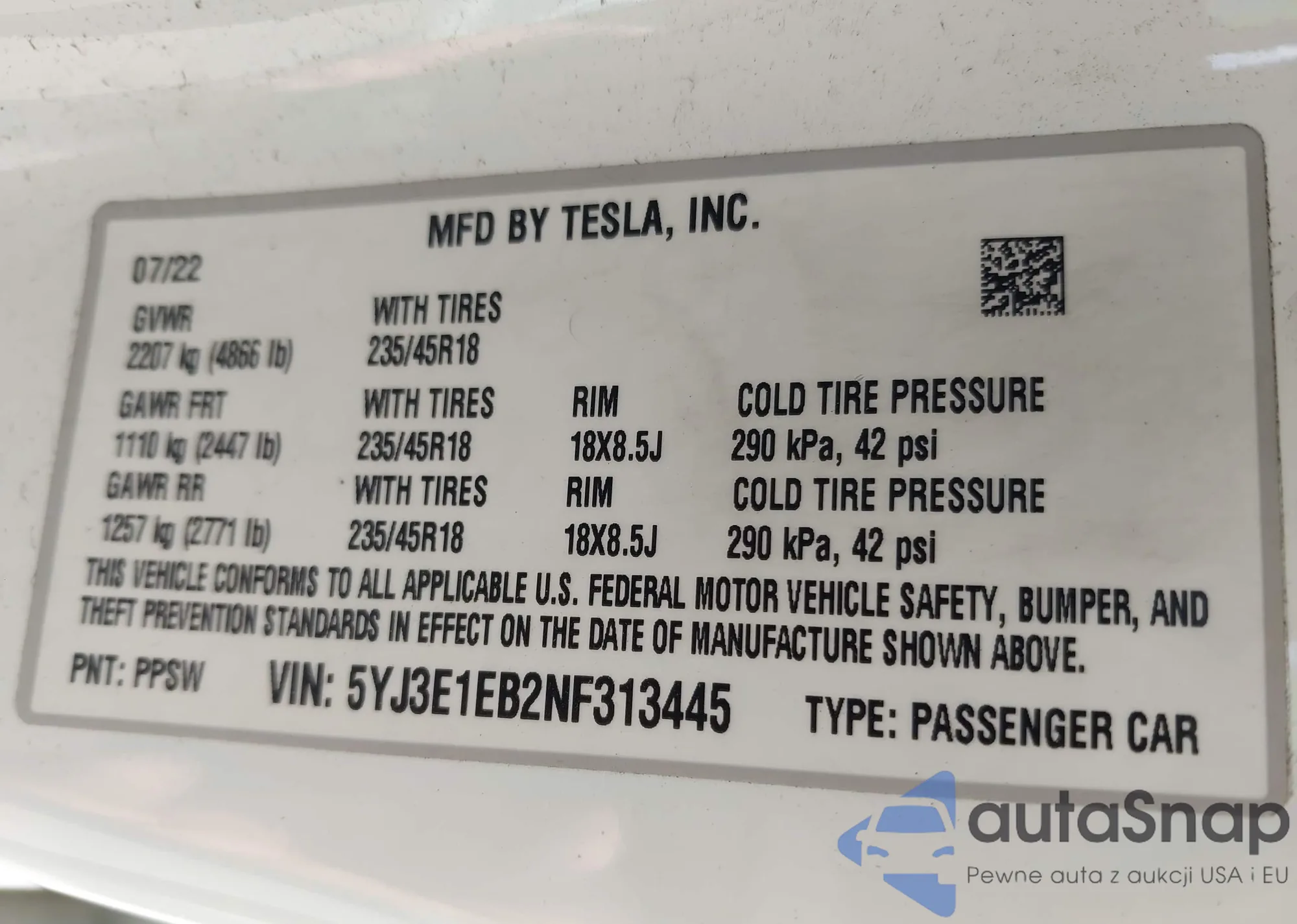 VIN: 5YJ3E1EB2NF313445