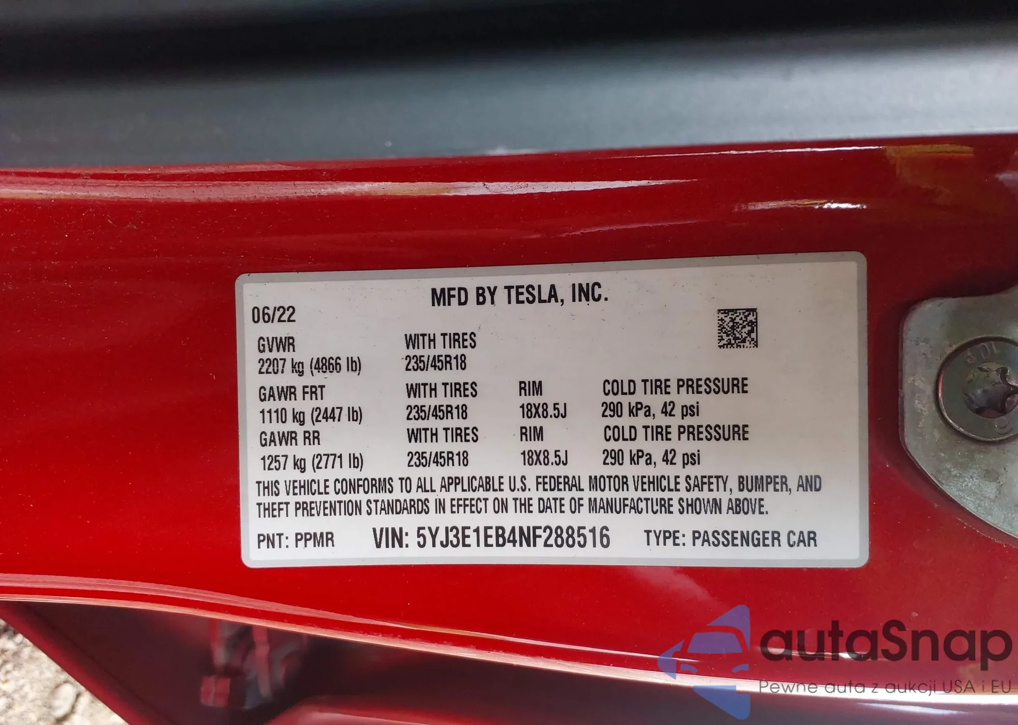 The car Tesla Model 3 2022 (VIN 5YJ3E1EB4NF288516) has not been auctioned before. The documents are clean, and the mileage matches or is below the market average. Sold by an insurance company – we recommend purchase. Delivery to the port will take approx. 6–8 weeks.