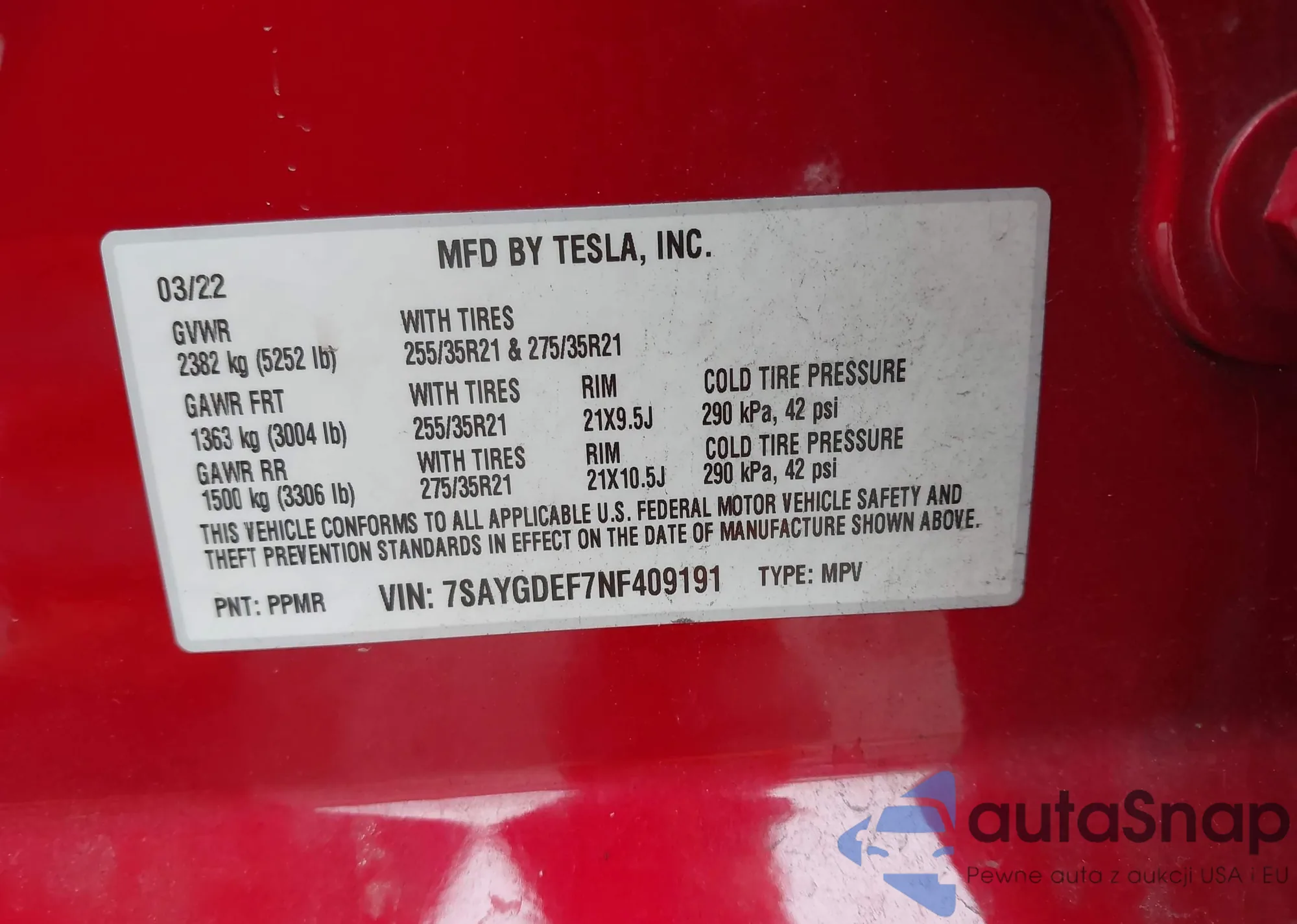 The car Tesla Model Y 2022 (VIN 7SAYGDEF7NF409191) has not been auctioned before. The documents are clean, and the mileage matches or is below the market average. Sold by an insurance company – we recommend purchase. Delivery to the port will take approx. 6–8 weeks.