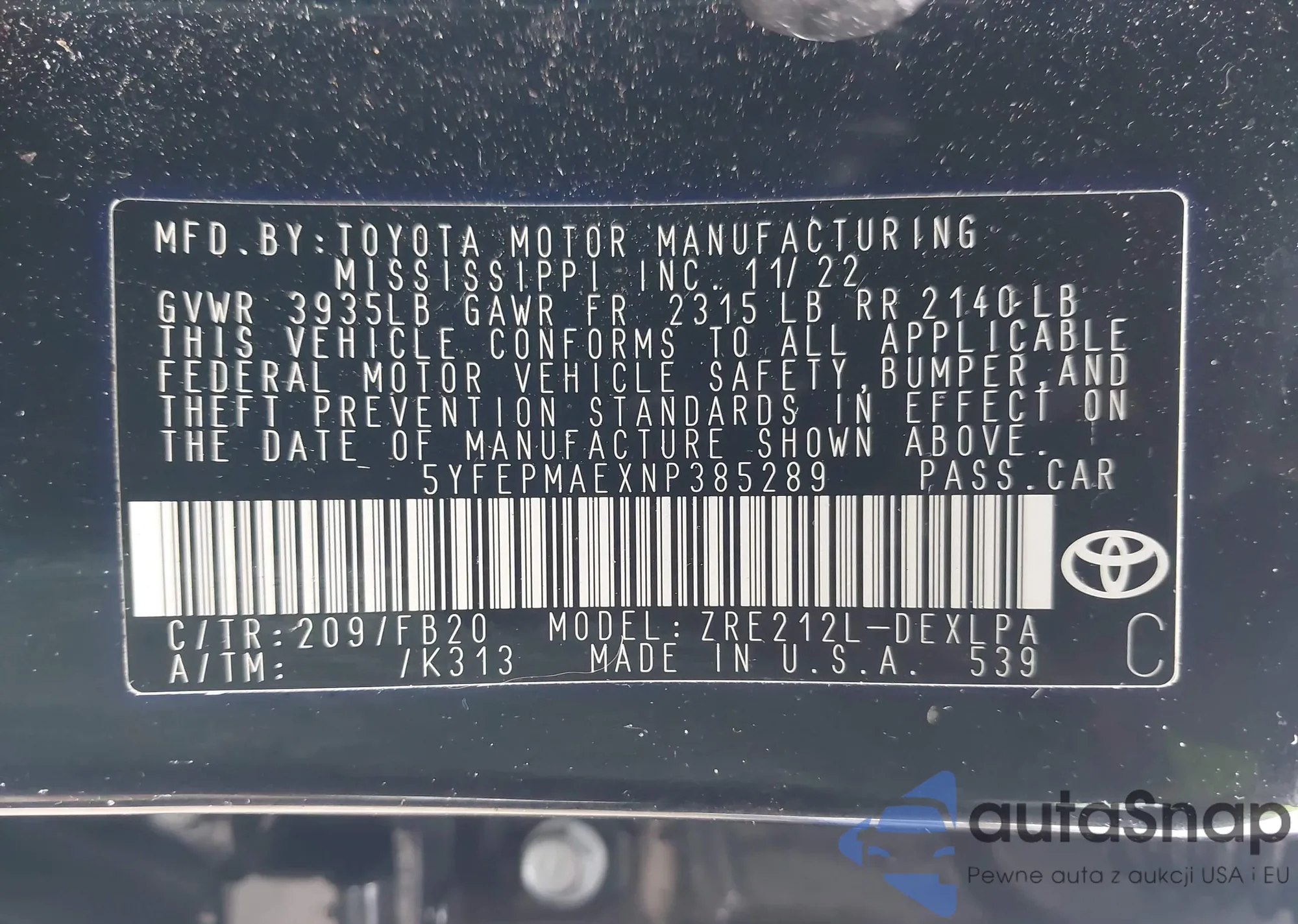 The car Toyota Corolla 2022 (VIN 5YFEPMAEXNP385289) has not been auctioned before. The documents are clean, and the mileage matches or is below the market average. Sold by an insurance company – we recommend purchase. Delivery to the port will take approx. 6–8 weeks.