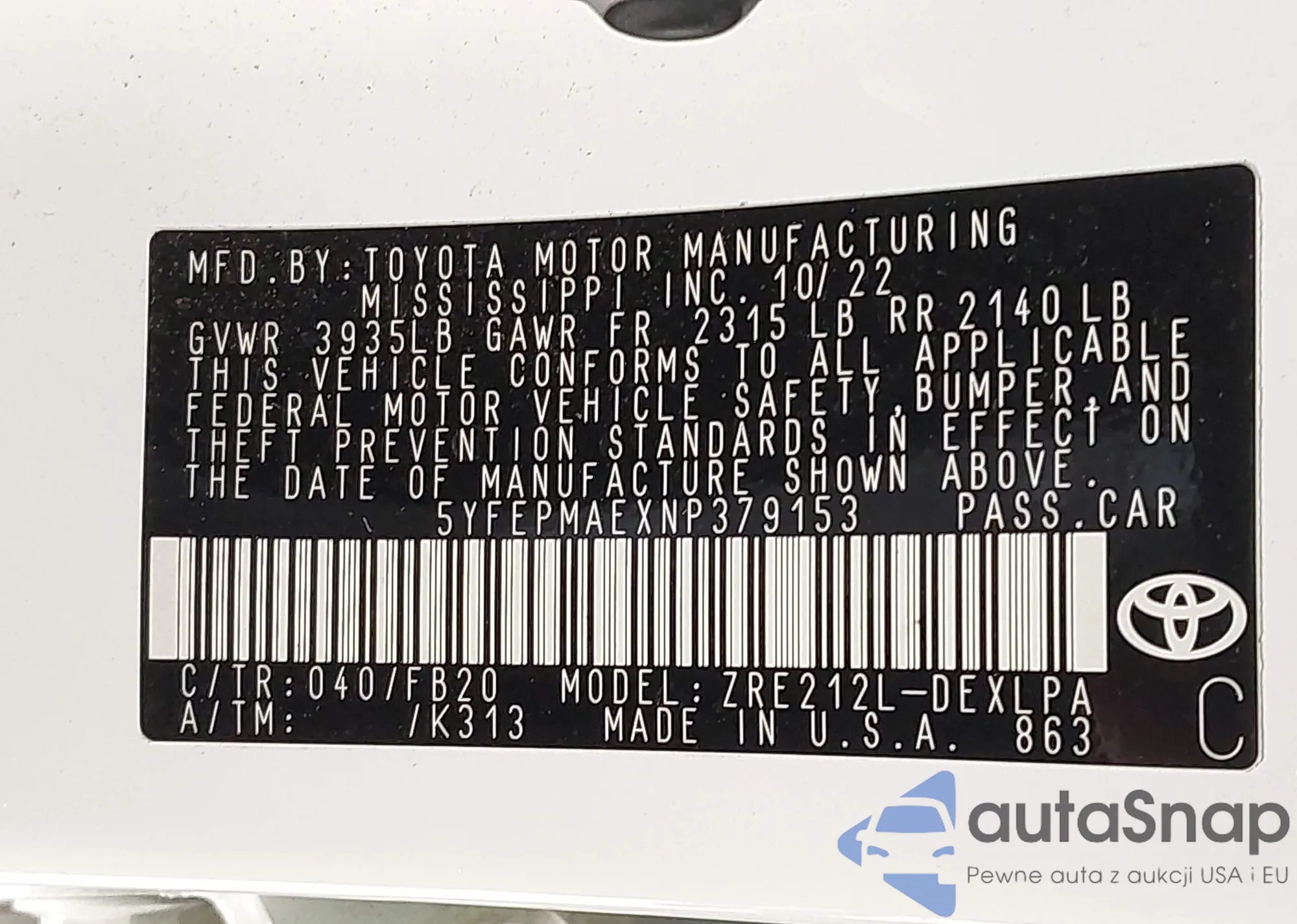 The car Toyota Corolla 2022 (VIN 5YFEPMAEXNP379153) has documents that prevent registration. Export and registration may be difficult. Contact AutaSnap experts to find alternatives.