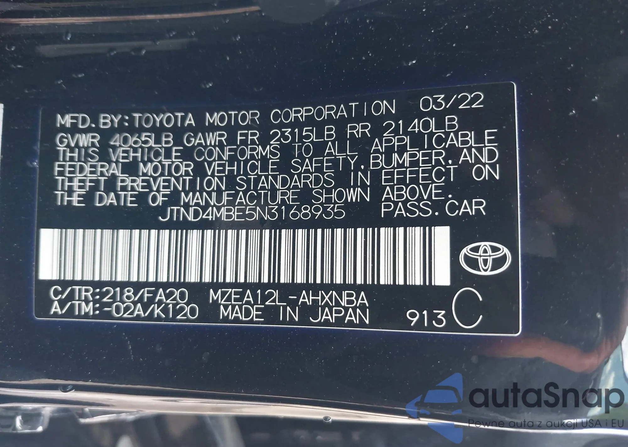 VIN: JTND4MBE5N3168935