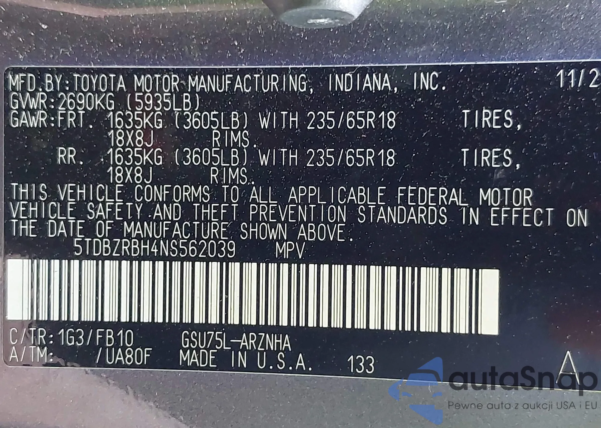 VIN: 5TDBZRBH4NS562039
