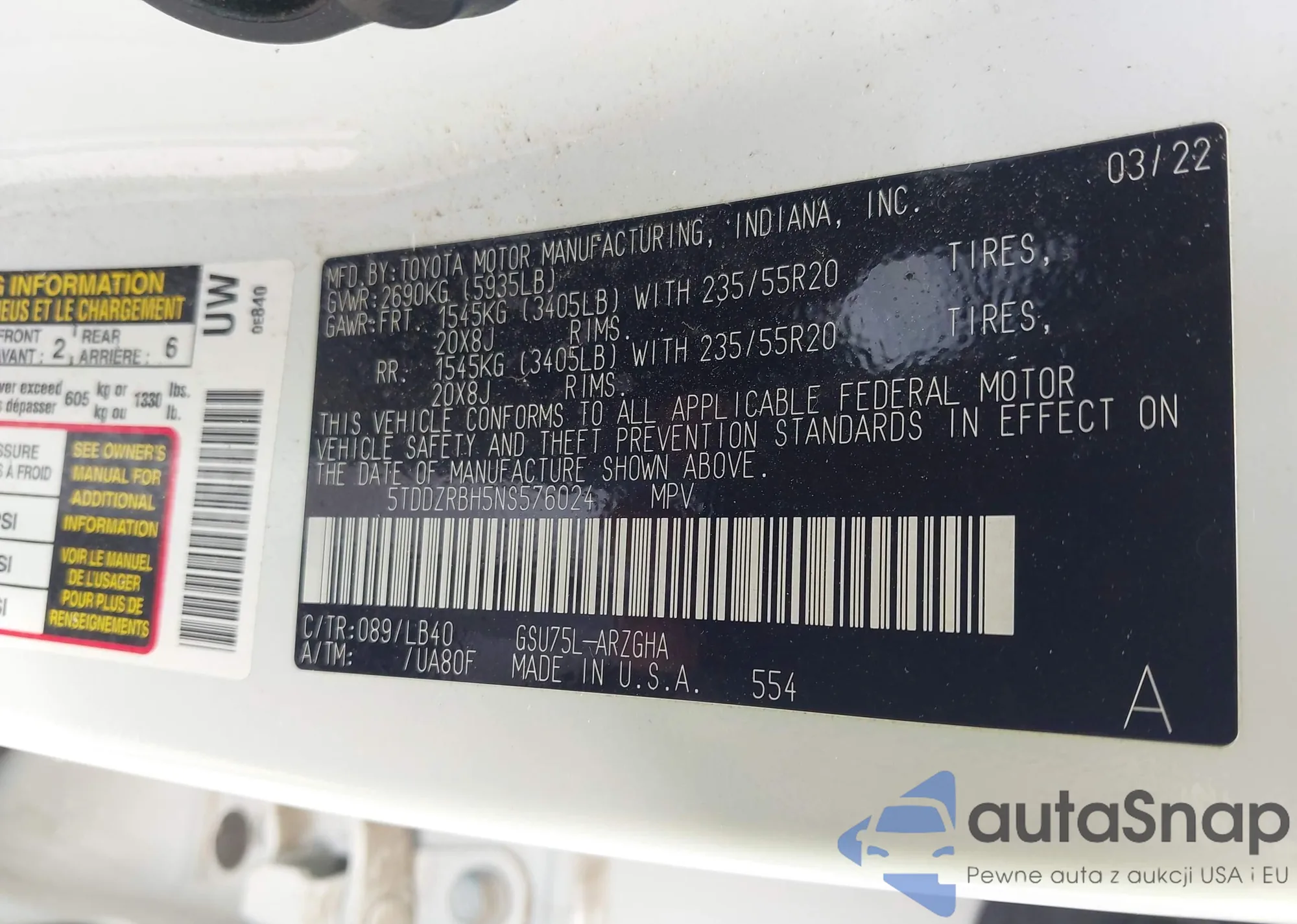 VIN: 5TDDZRBH5NS576024