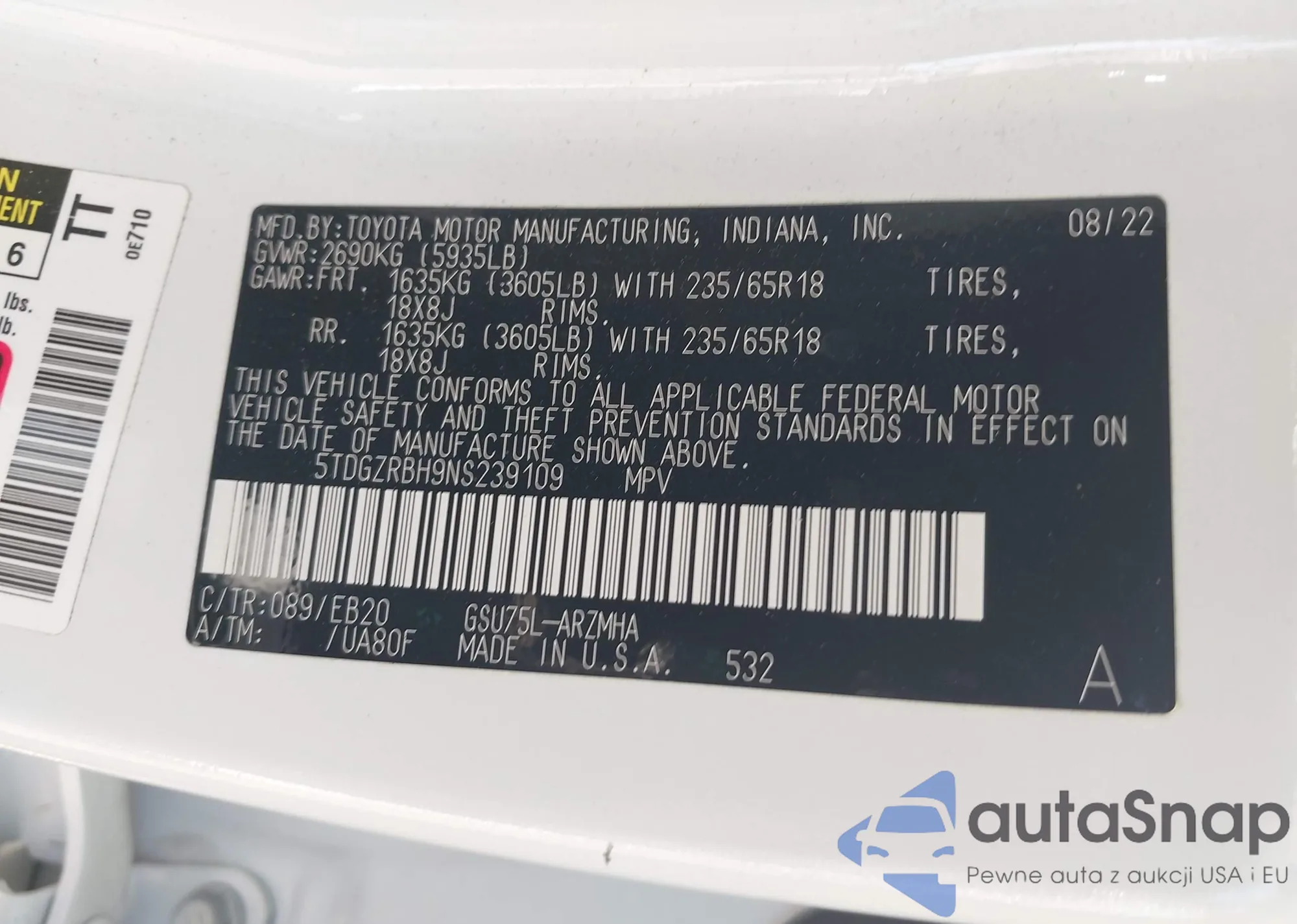 VIN: 5TDGZRBH9NS239109