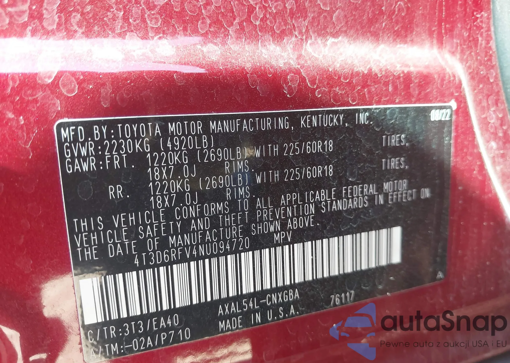 The car Toyota RAV 4 2022 (VIN 4T3D6RFV4NU094720) has not been auctioned before. The documents are clean, and the mileage matches or is below the market average. Sold by an insurance company – we recommend purchase. Delivery to the port will take approx. 6–8 weeks.