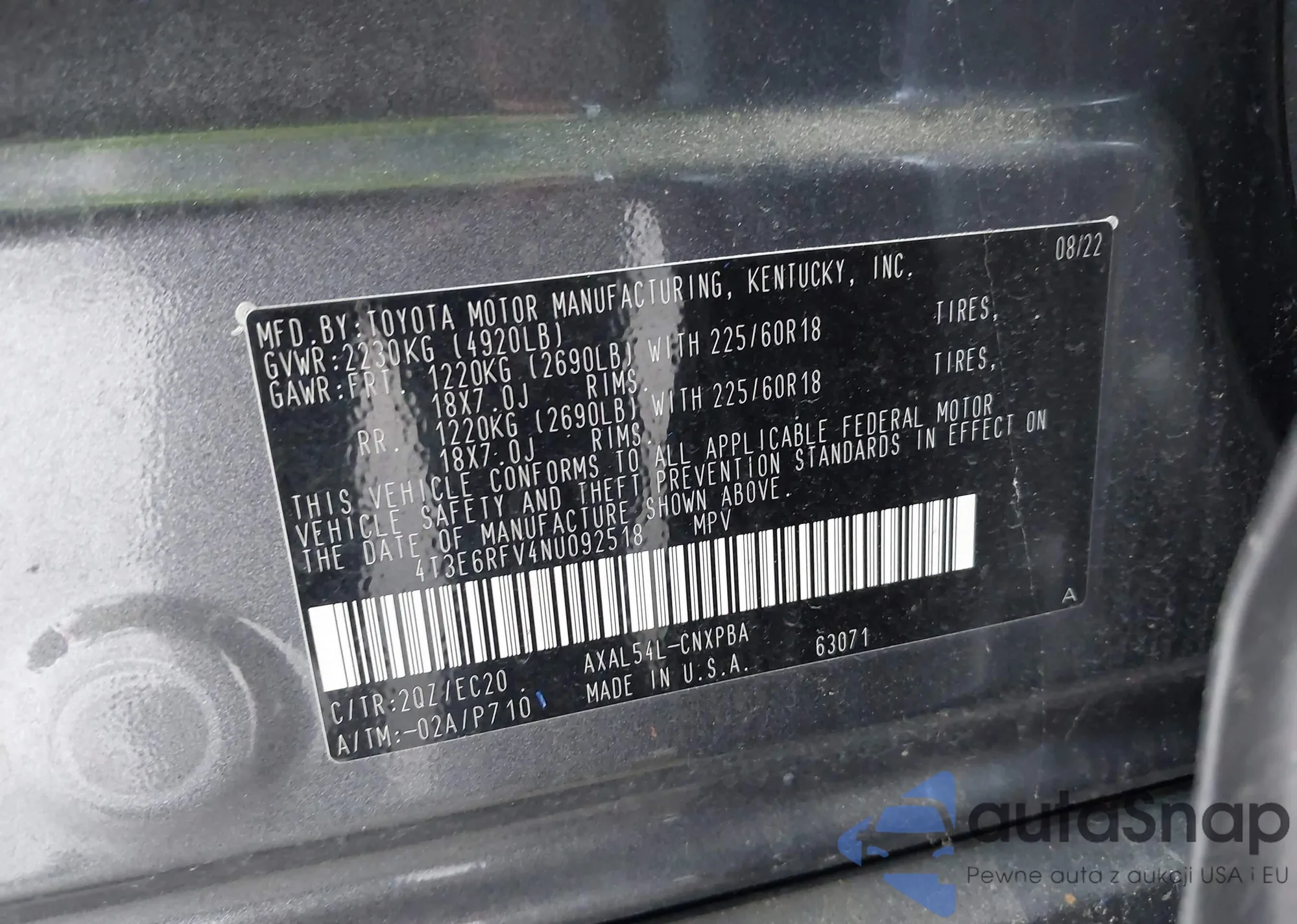 VIN: 4T3E6RFV4NU092518