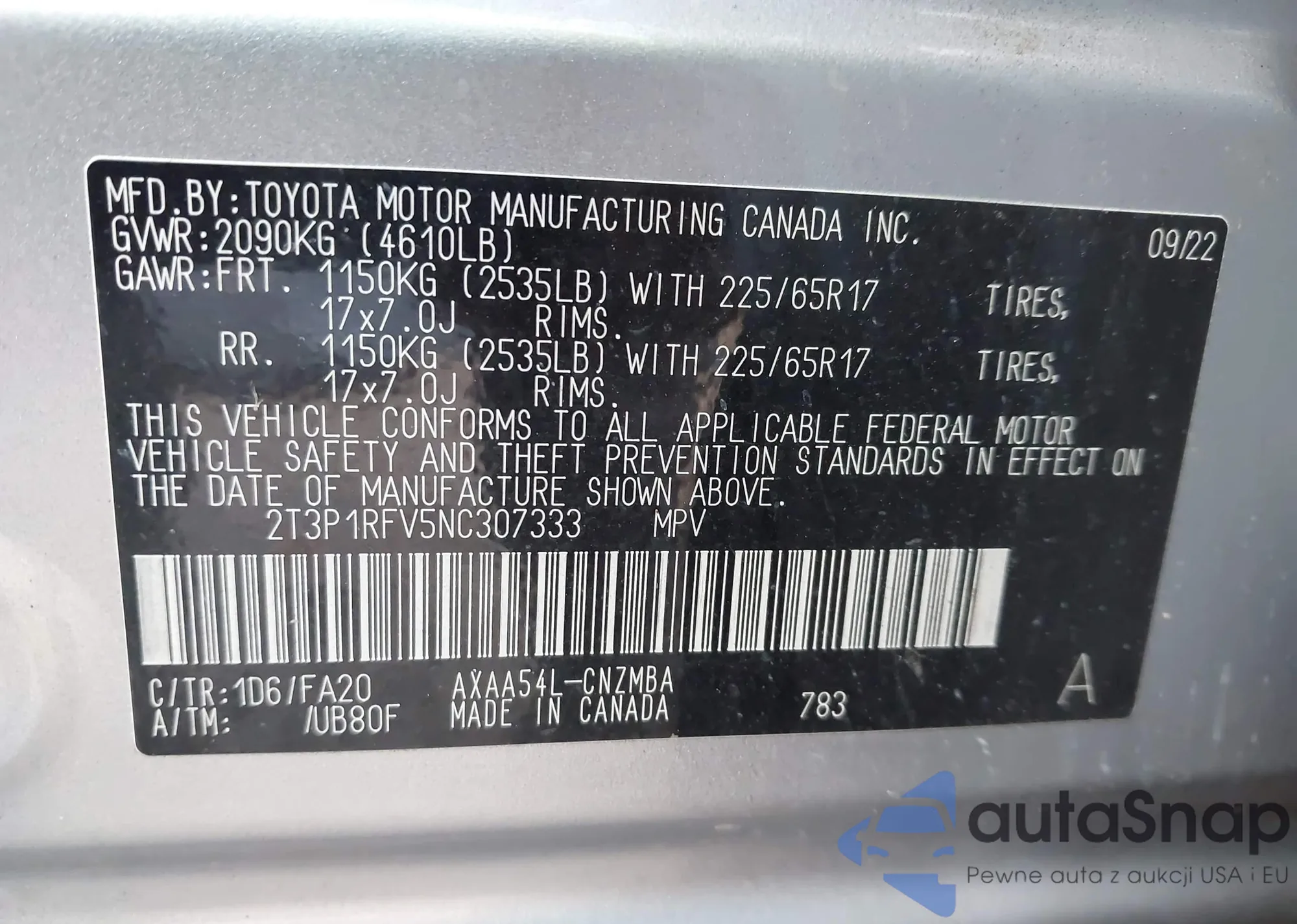 The car Toyota RAV 4 2022 (VIN 2T3P1RFV5NC307333) has not been auctioned before. The documents are clean, and the mileage matches or is below the market average. Sold by an insurance company – we recommend purchase. Delivery to the port will take approx. 6–8 weeks.