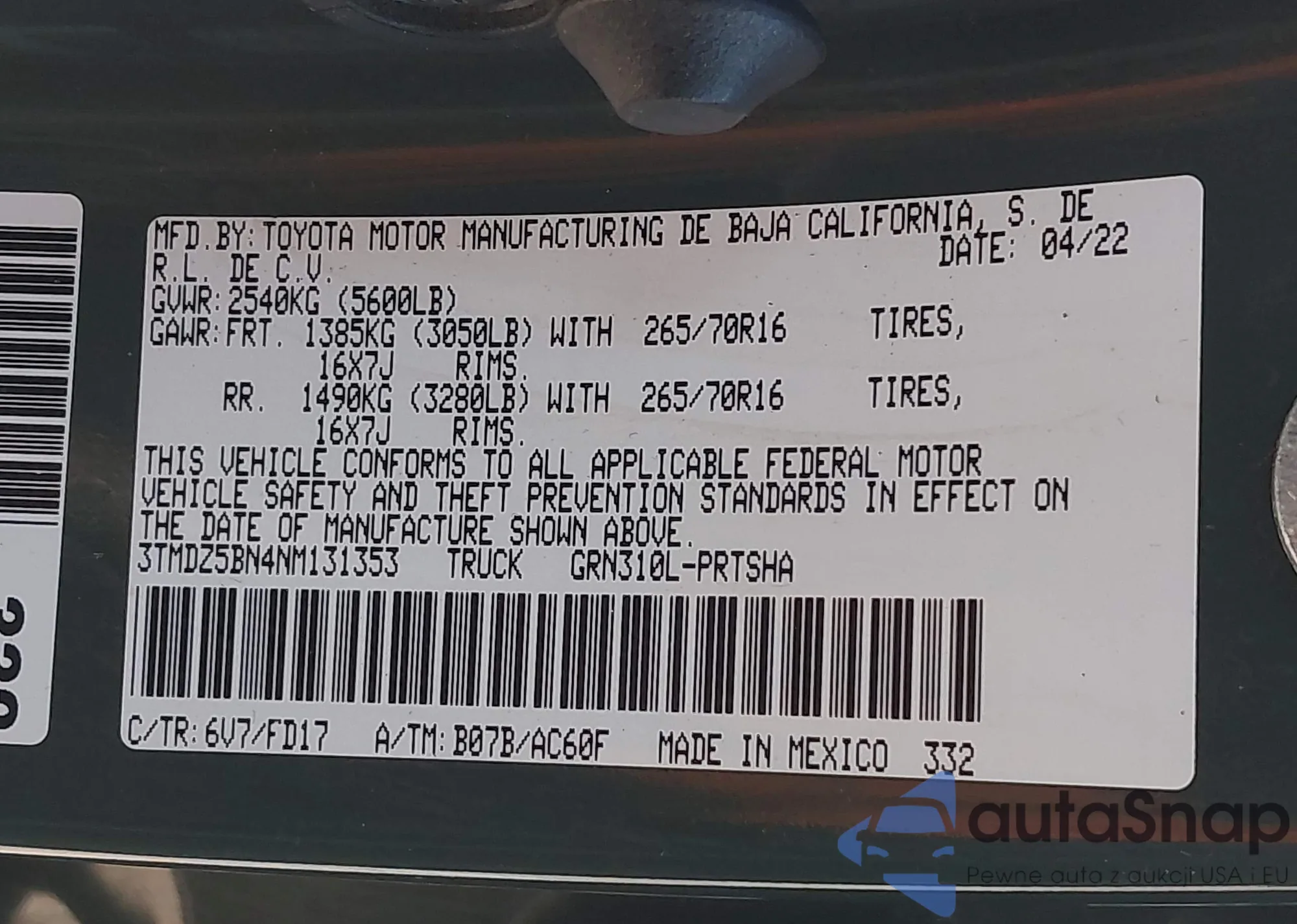 The car Toyota Tacoma 2022 (VIN 3TMDZ5BN4NM131353) has not been auctioned before. The documents are clean, and the mileage matches or is below the market average. Sold by an insurance company – we recommend purchase. Delivery to the port will take approx. 6–8 weeks.
