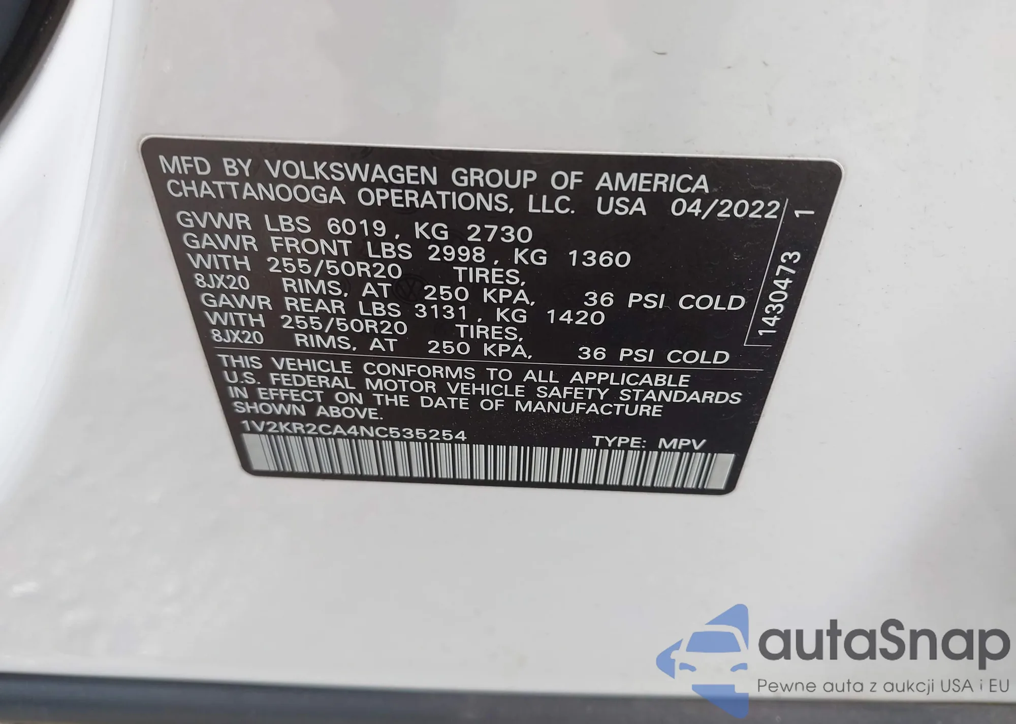 • VIN: 1V2KR2CA4NC535254