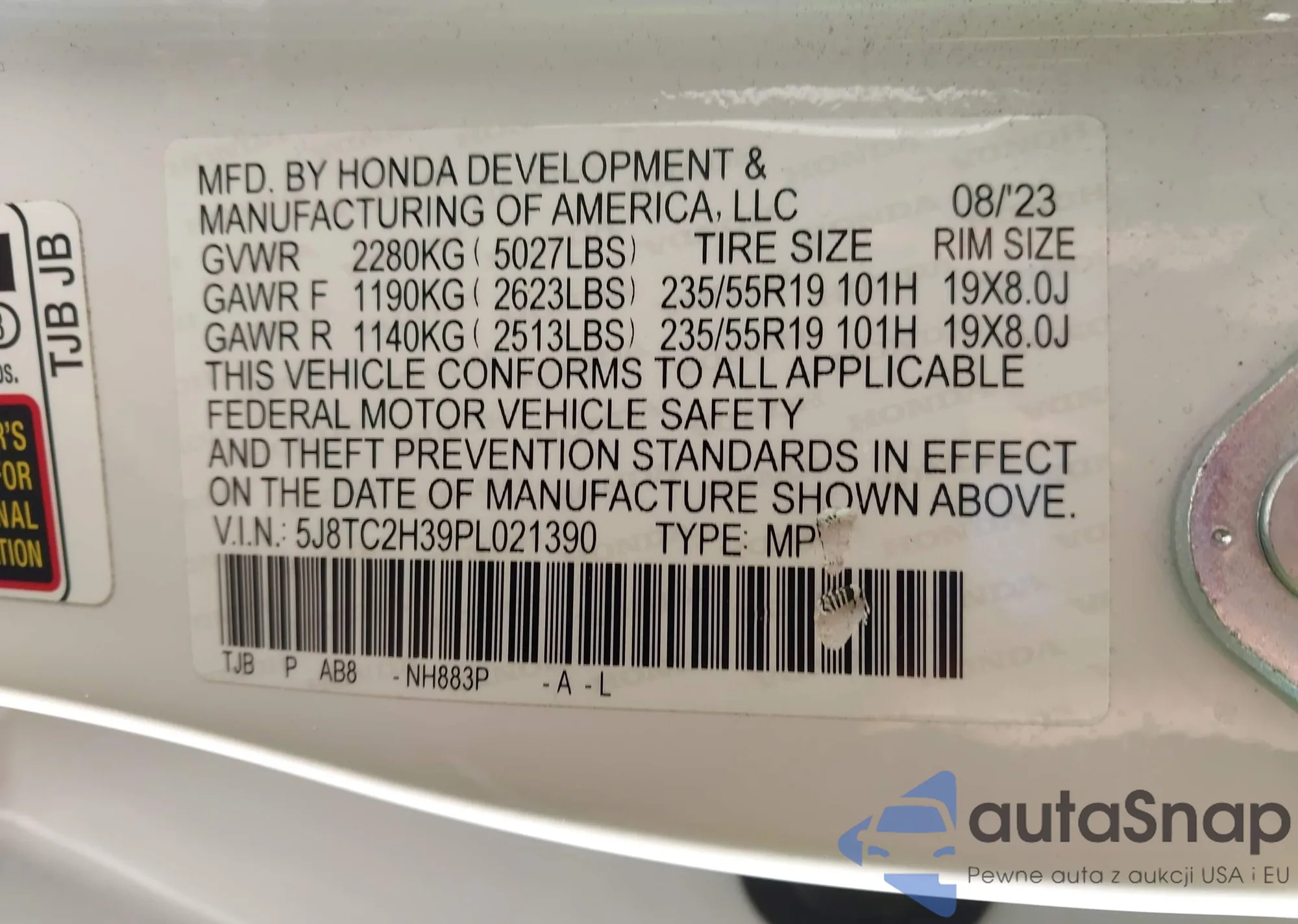 The car Acura RDX 2023 (VIN 5J8TC2H39PL021390) has not been auctioned before. The documents are clean, and the mileage matches or is below the market average. Sold by an insurance company – we recommend purchase. Delivery to the port will take approx. 6–8 weeks.