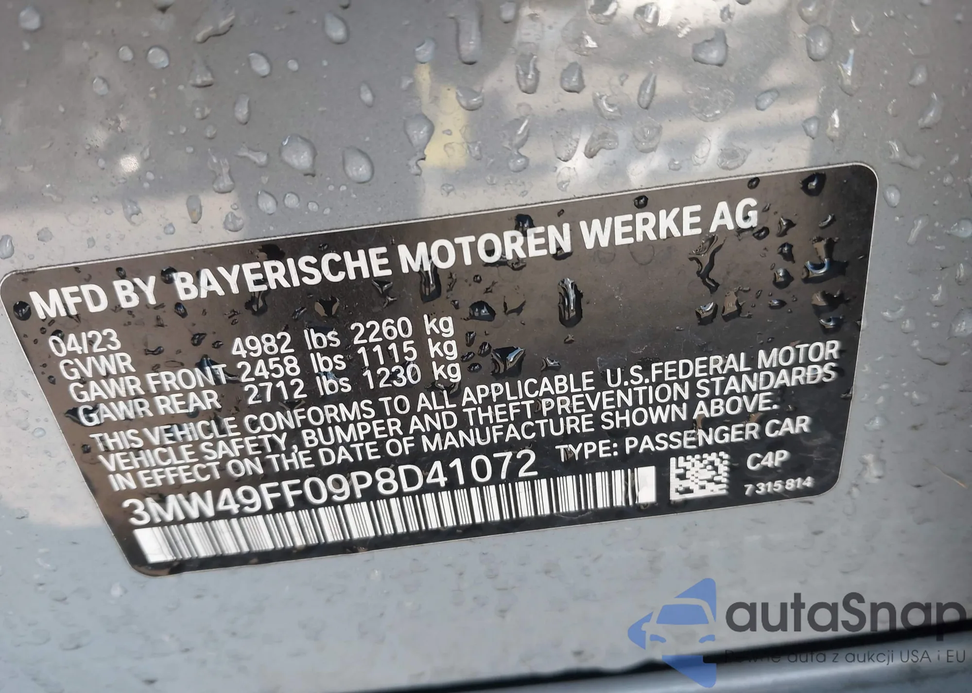 The car BMW 3er 2023 (VIN 3MW49FF09P8D41072) has not been auctioned before. The documents are clean, and the mileage matches or is below the market average. Sold by an insurance company – we recommend purchase. Delivery to the port will take approx. 6–8 weeks.