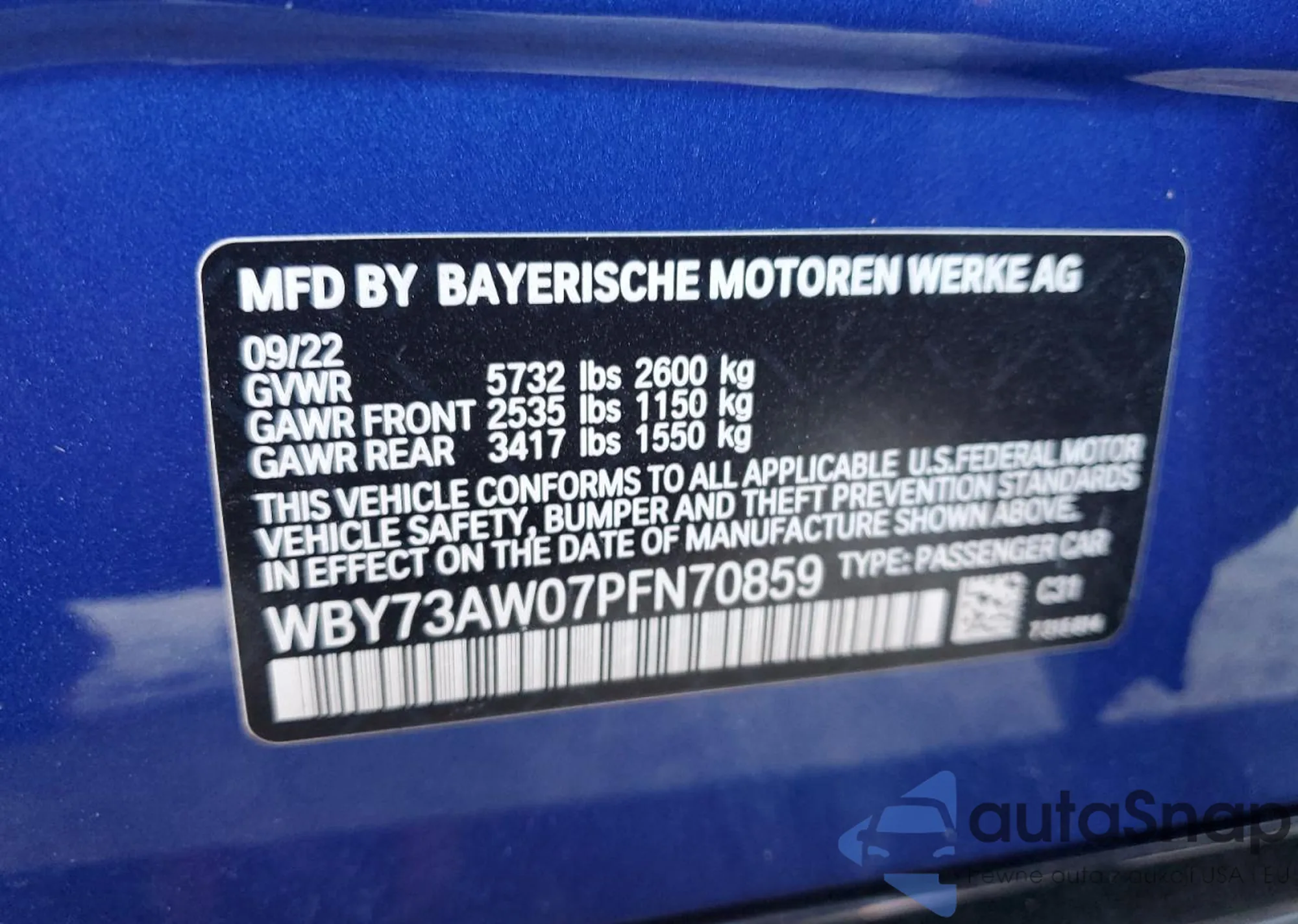 The car BMW i4 2023 (VIN WBY73AW07PFN70859) has documents that prevent registration. Export and registration may be difficult. Contact AutaSnap experts to find alternatives.