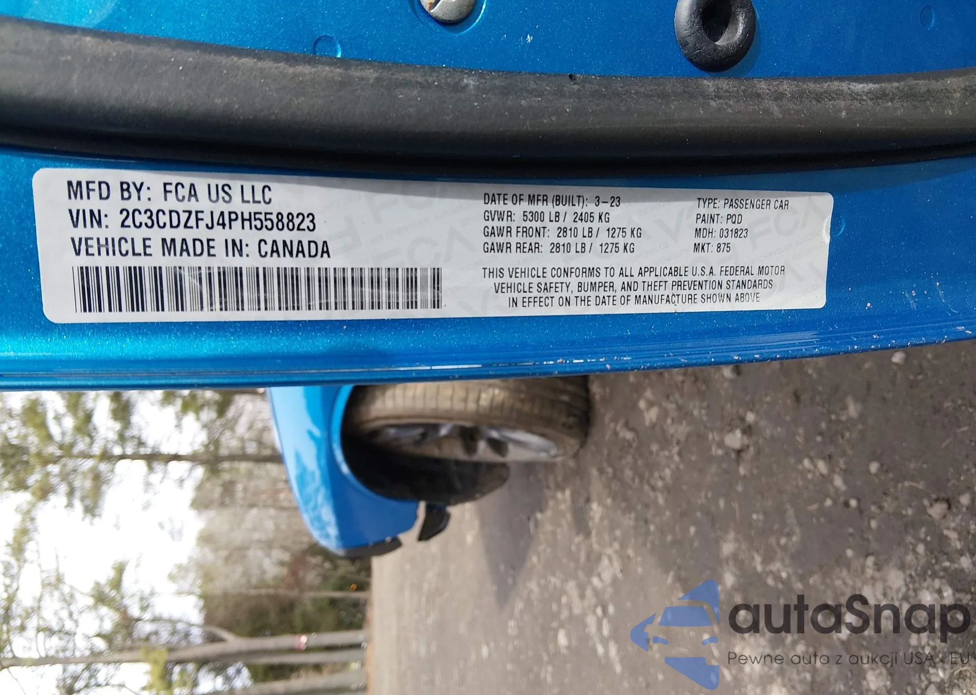 The car Dodge Challenger 2023 (VIN 2C3CDZFJ4PH558823) has not been auctioned before. The documents are clean, and the mileage matches or is below the market average. Sold by an insurance company – we recommend purchase. Delivery to the port will take approx. 6–8 weeks.