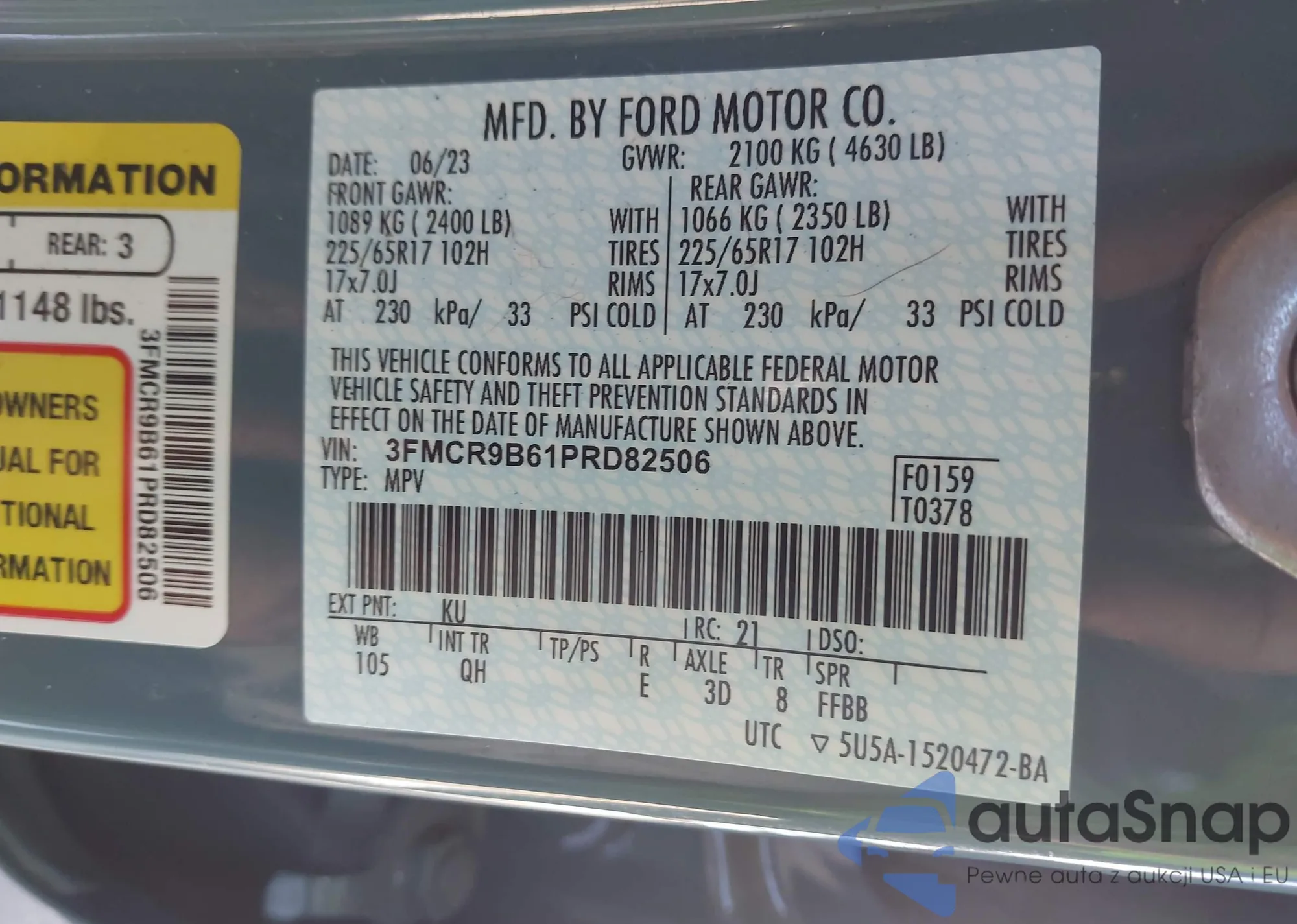 The car Ford Bronco Sport 2023 (VIN 3FMCR9B61PRD82506) has not been auctioned before. The documents are clean, and the mileage matches or is below the market average. Sold by an insurance company – we recommend purchase. Delivery to the port will take approx. 6–8 weeks.