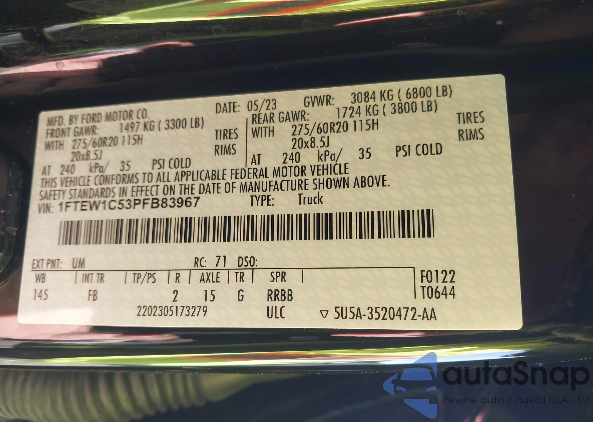 The car Ford F-150 2023 (VIN 1FTEW1C53PFB83967) has not been auctioned before. The documents are clean, and the mileage matches or is below the market average. Sold by an insurance company – we recommend purchase. Delivery to the port will take approx. 6–8 weeks.