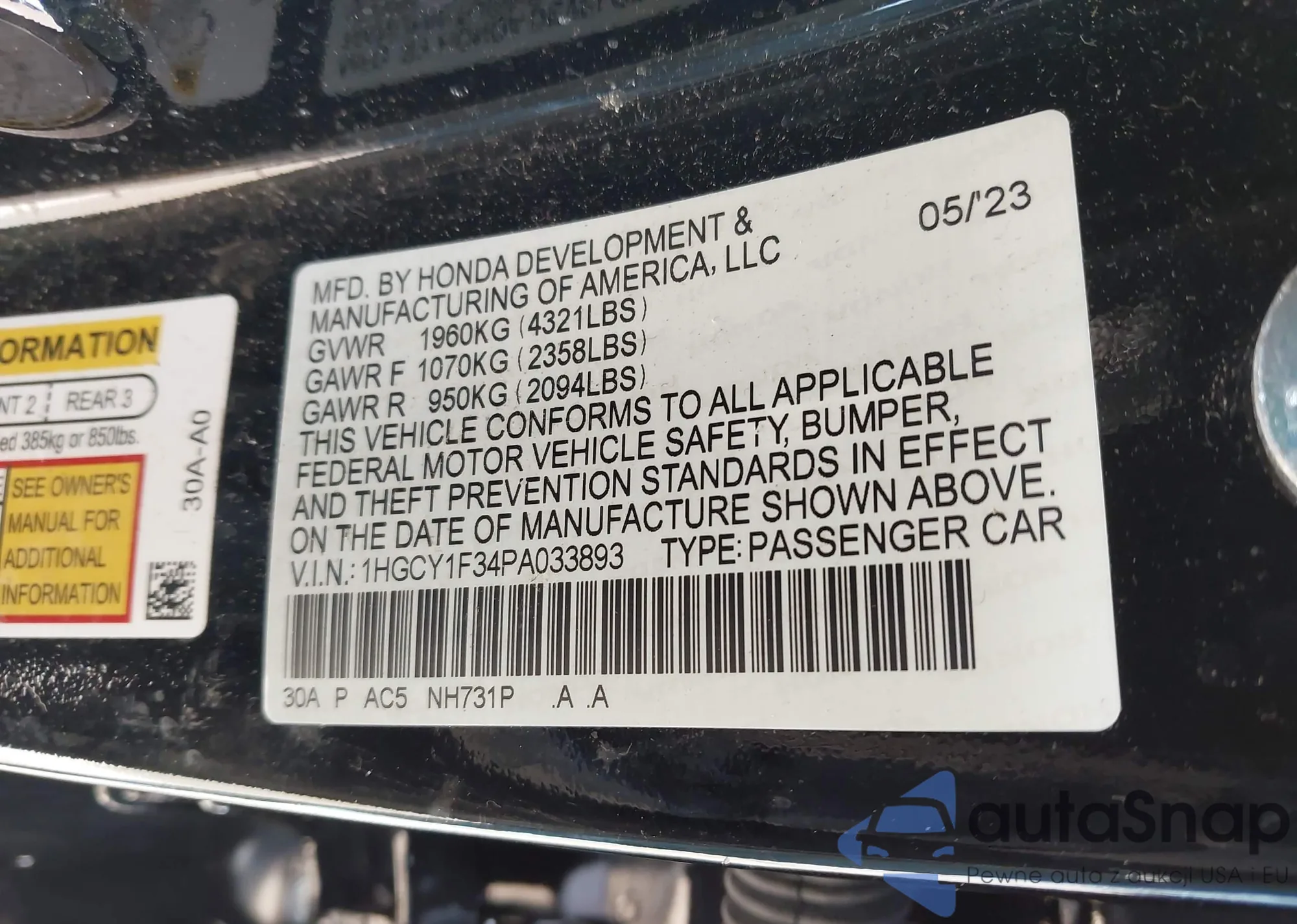 The car Honda Accord 2023 (VIN 1HGCY1F34PA033893) has not been auctioned before. The documents are clean, and the mileage matches or is below the market average. Sold by an insurance company – we recommend purchase. Delivery to the port will take approx. 6–8 weeks.