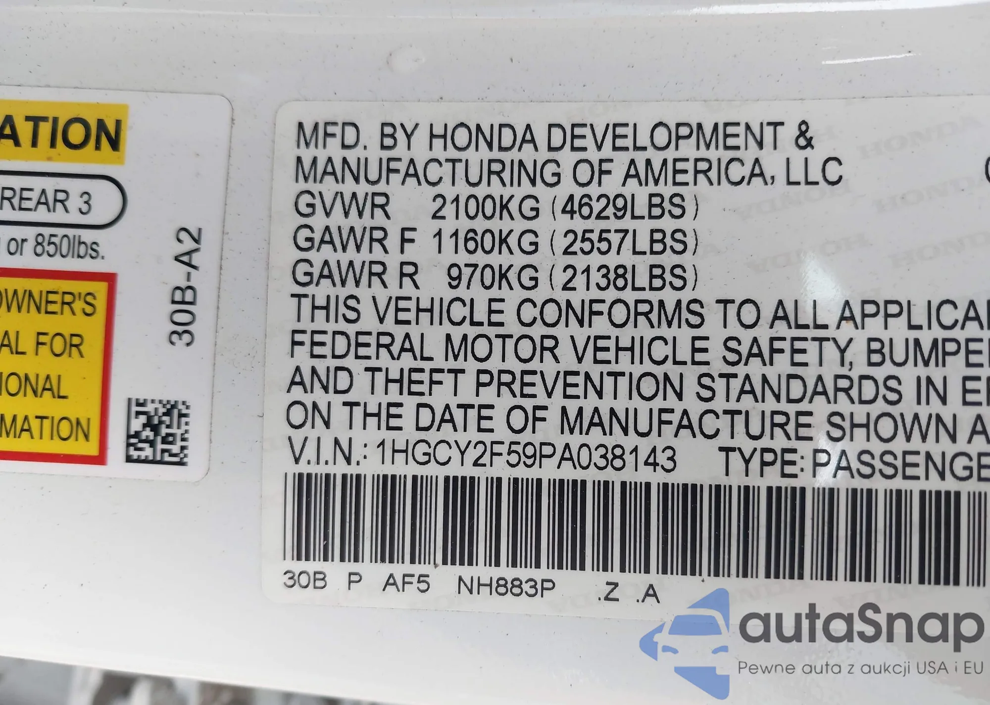 • VIN: 1HGCY2F59PA038143