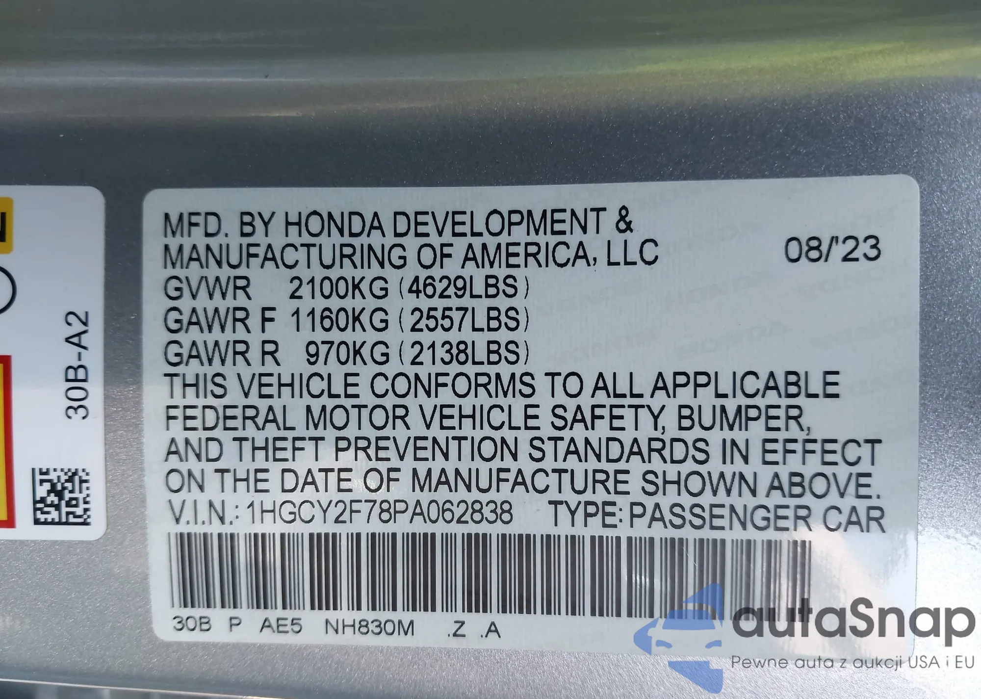 The car Honda Accord 2023 (VIN 1HGCY2F78PA062838) has not been auctioned before. The documents are clean, and the mileage matches or is below the market average. Sold by an insurance company – we recommend purchase. Delivery to the port will take approx. 6–8 weeks.