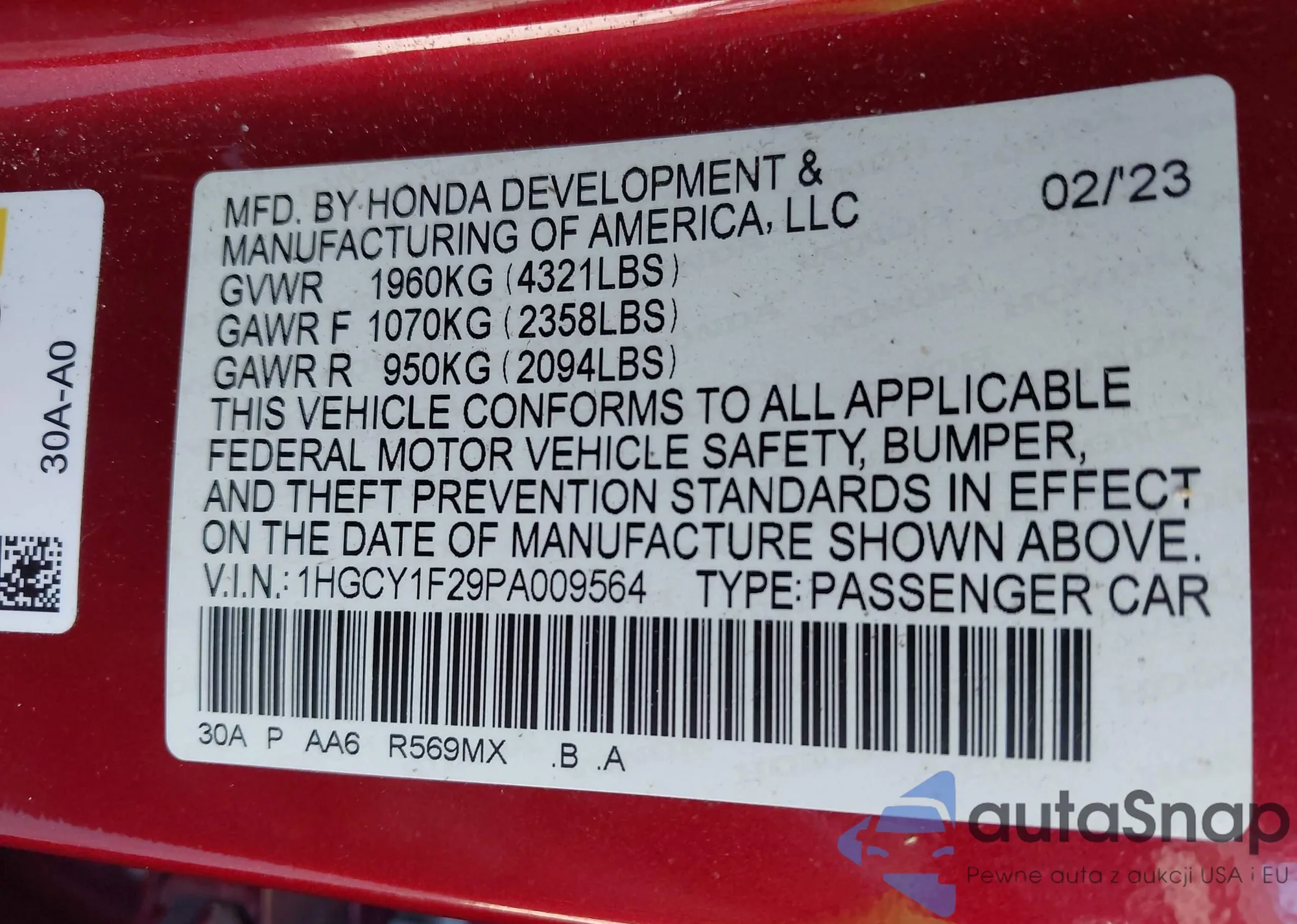 VIN: 1HGCY1F29PA009564