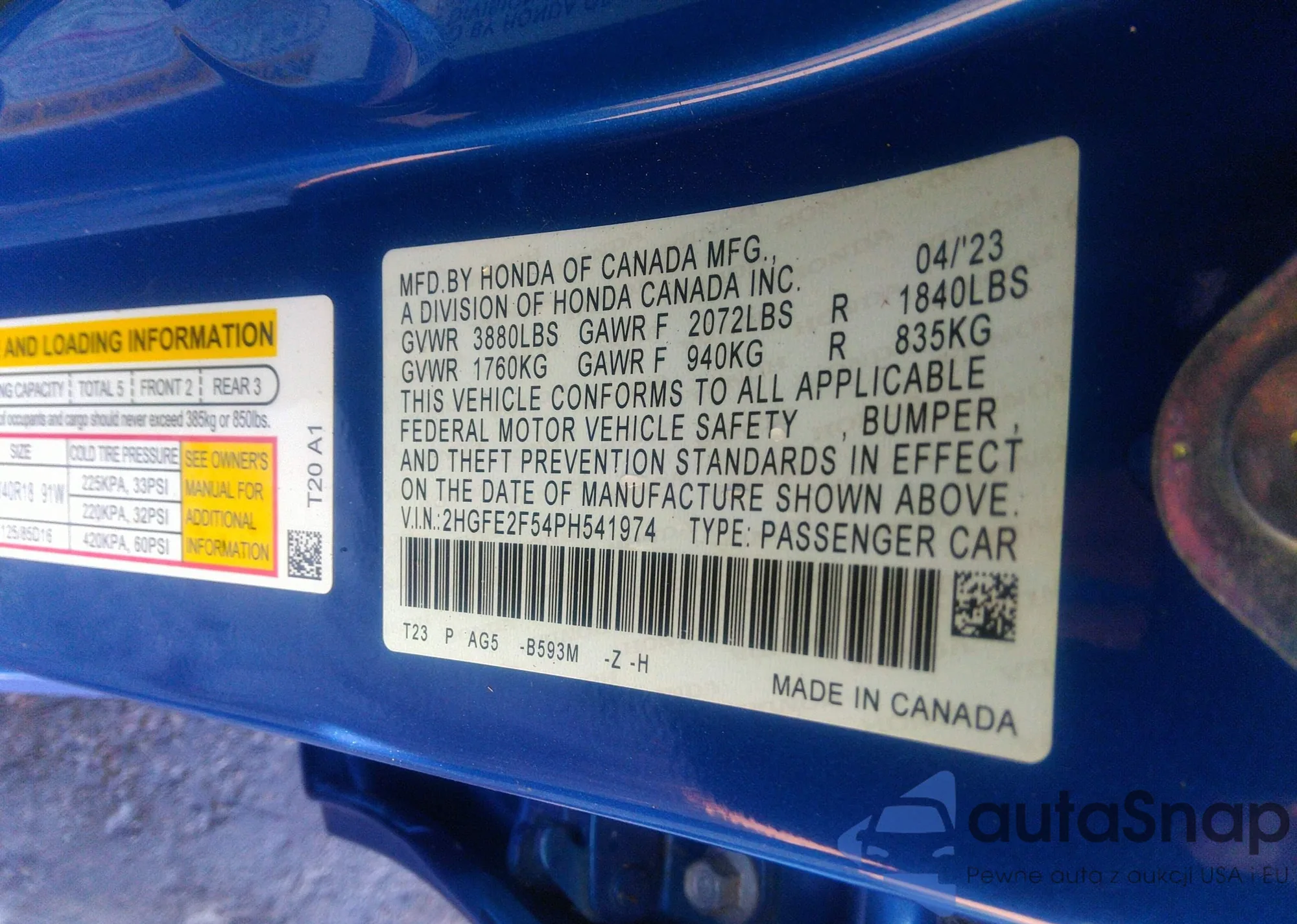 The car Honda Civic 2023 (VIN 2HGFE2F54PH541974) has not been auctioned before. The documents are clean, and the mileage matches or is below the market average. Sold by an insurance company – we recommend purchase. Delivery to the port will take approx. 6–8 weeks.
