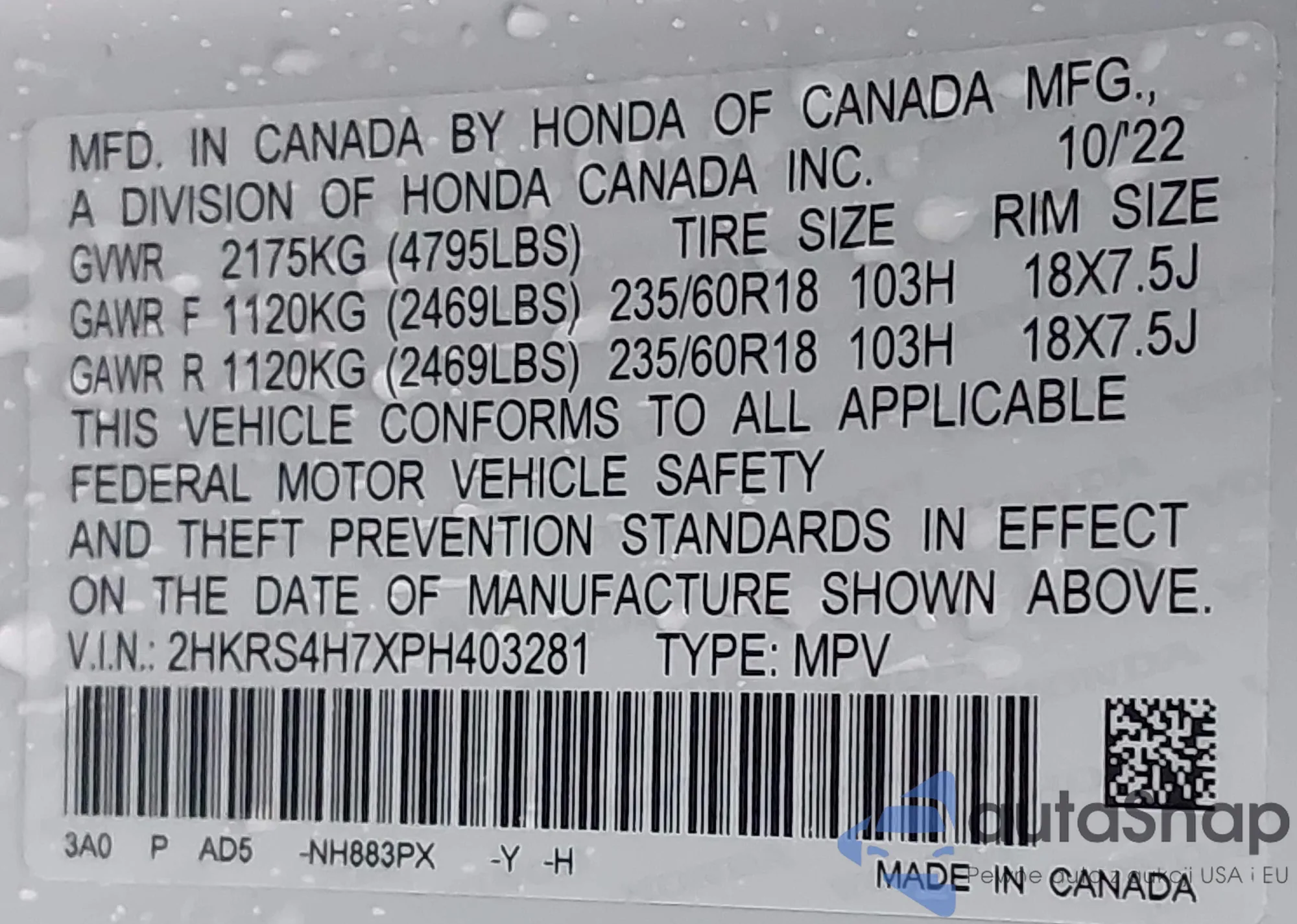 VIN: 2HKRS4H7XPH403281