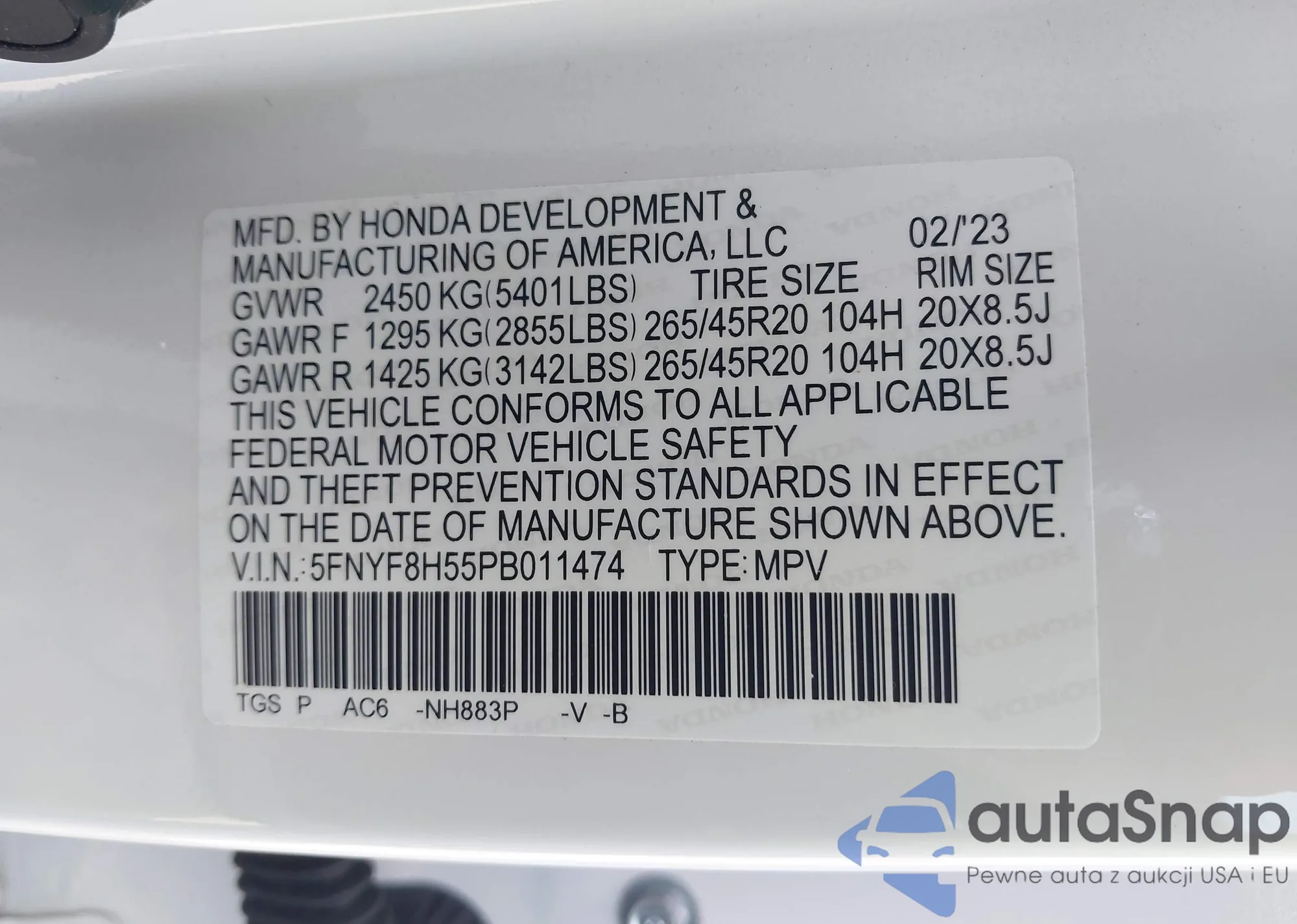 VIN: 5FNYF8H55PB011474