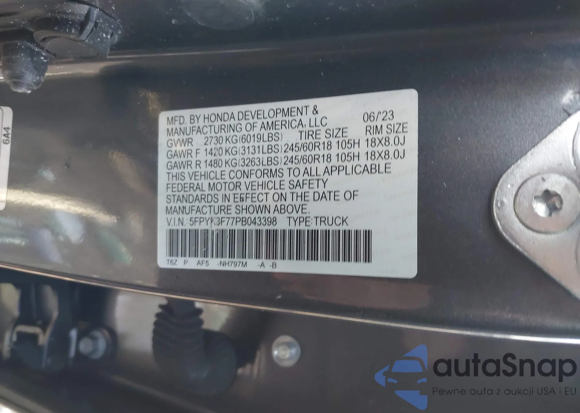 • VIN: 5FPYK3F77PB043398