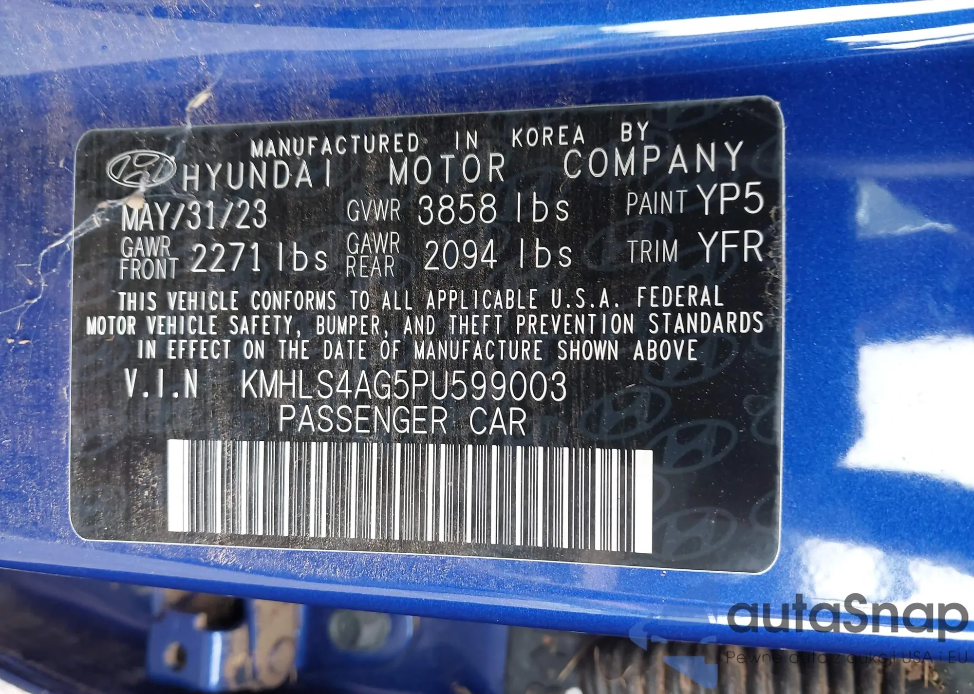 The car Hyundai Elantra 2023 (VIN KMHLS4AG5PU599003) has not been auctioned before. The documents are clean, and the mileage matches or is below the market average. Sold by an insurance company – we recommend purchase. Delivery to the port will take approx. 6–8 weeks.