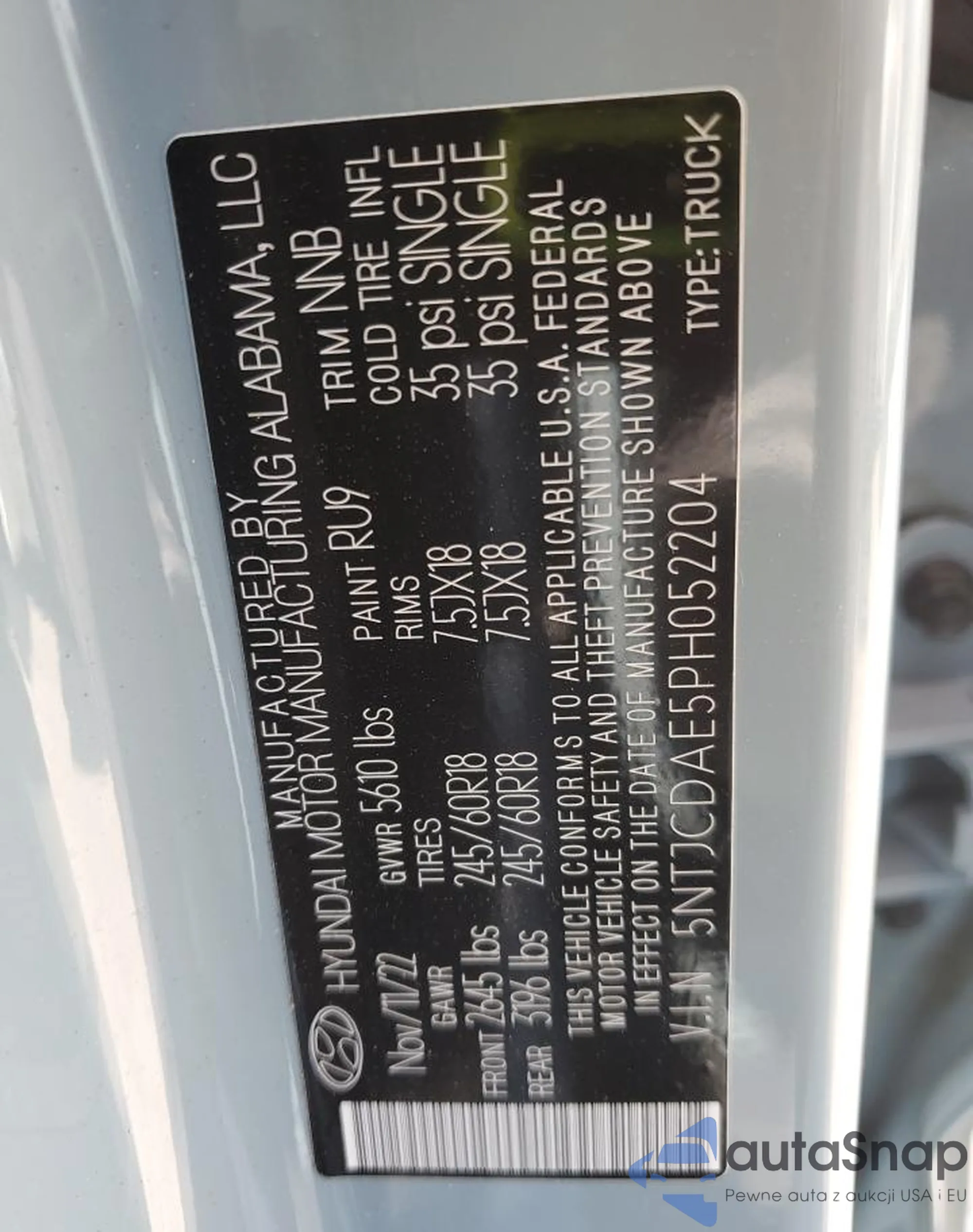 VIN: 5NTJCDAE5PH052204