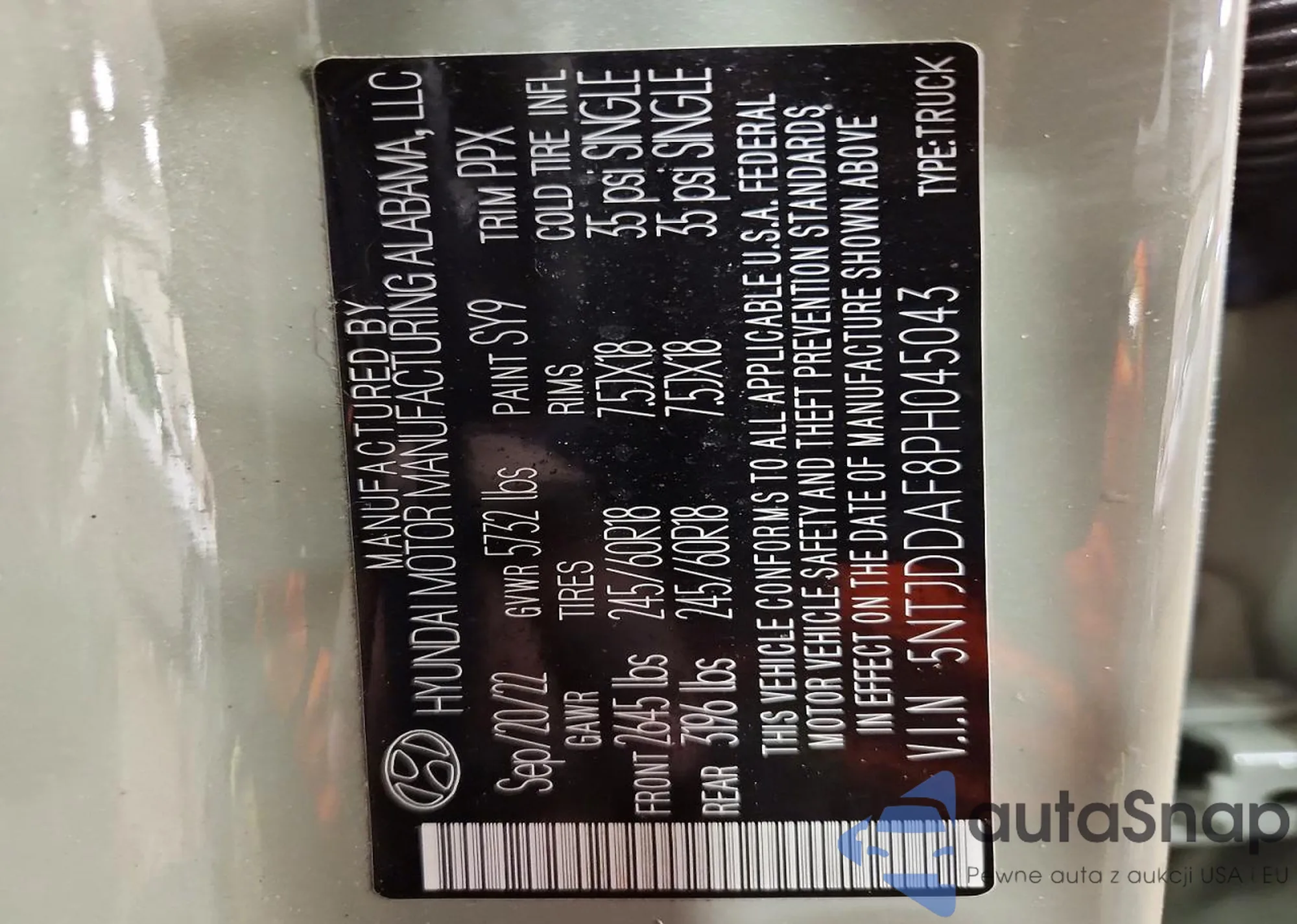 The car Hyundai Santa Cruz 2023 (VIN 5NTJDDAF8PH045043) has documents that prevent registration. Export and registration may be difficult. Contact AutaSnap experts to find alternatives.