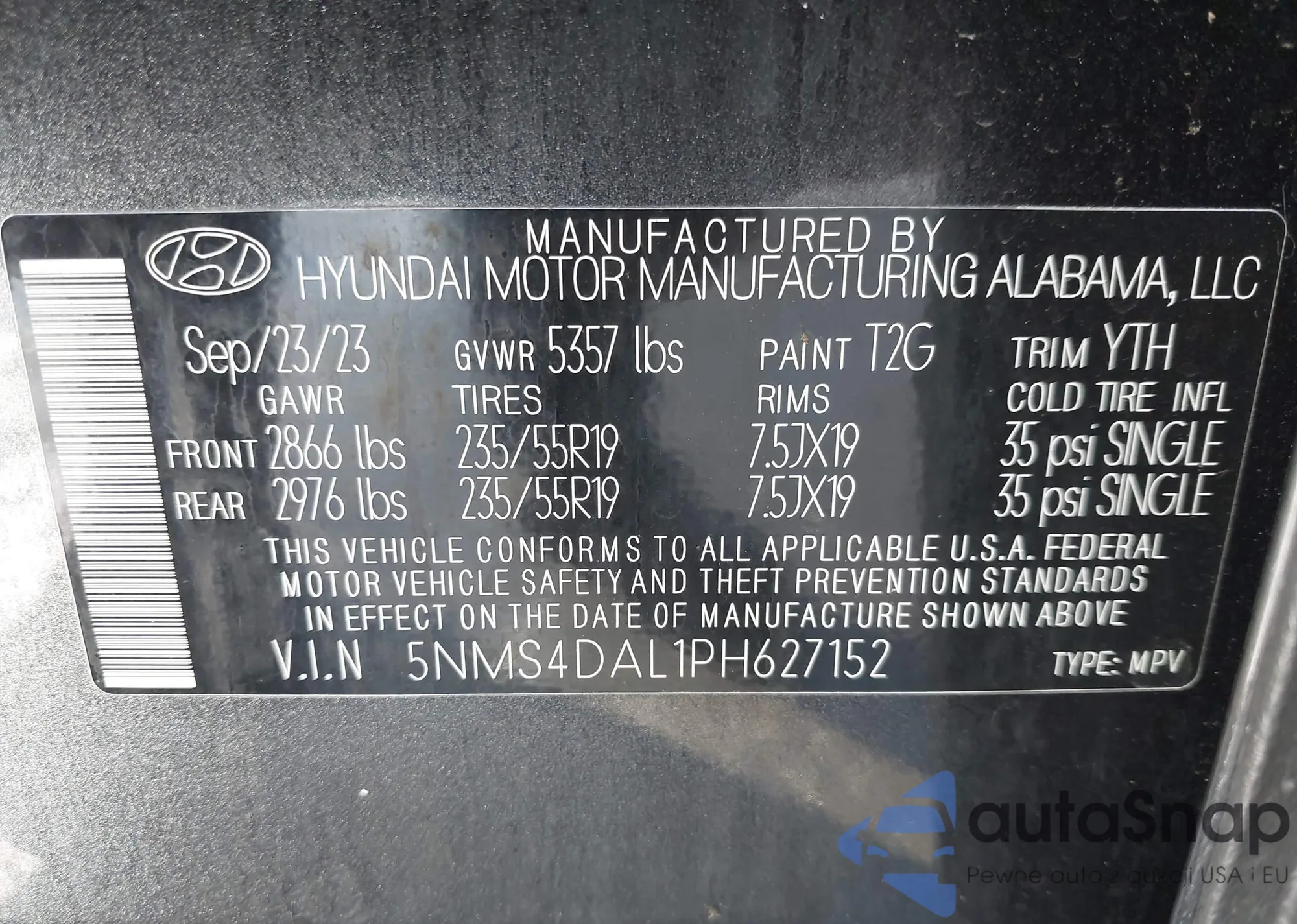 The car Hyundai Santa Fe 2023 (VIN 5NMS4DAL1PH627152) has not been auctioned before. The documents are clean, and the mileage matches or is below the market average. Sold by an insurance company – we recommend purchase. Delivery to the port will take approx. 6–8 weeks.