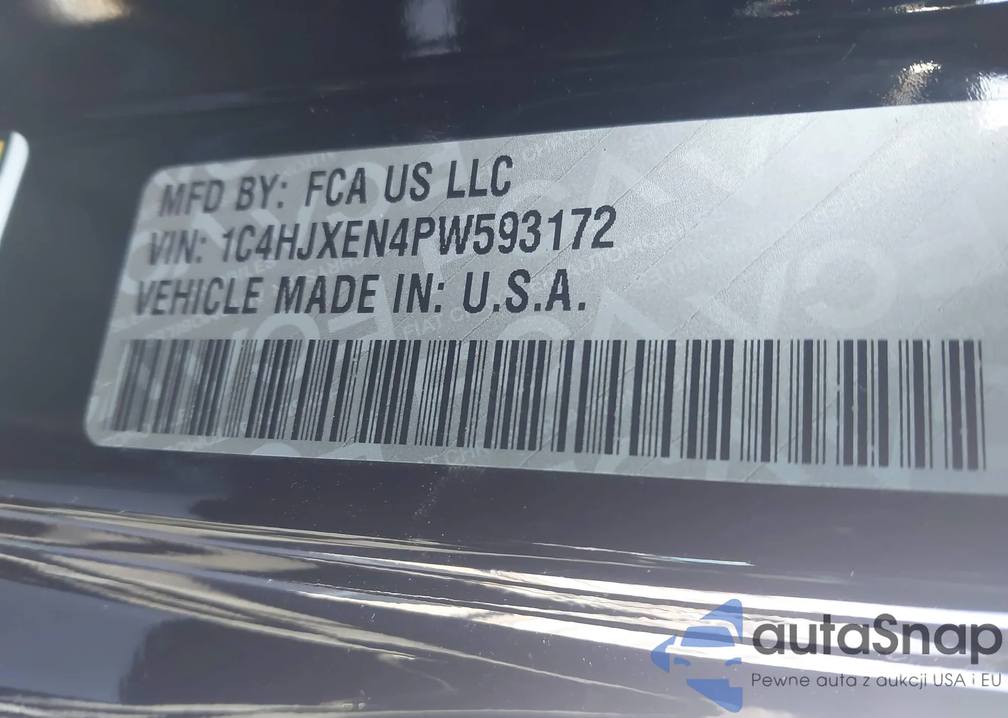 The car Jeep Wrangler 2023 (VIN 1C4HJXEN4PW593172) has not been auctioned before. The documents are clean, and the mileage matches or is below the market average. Sold by an insurance company – we recommend purchase. Delivery to the port will take approx. 6–8 weeks.
