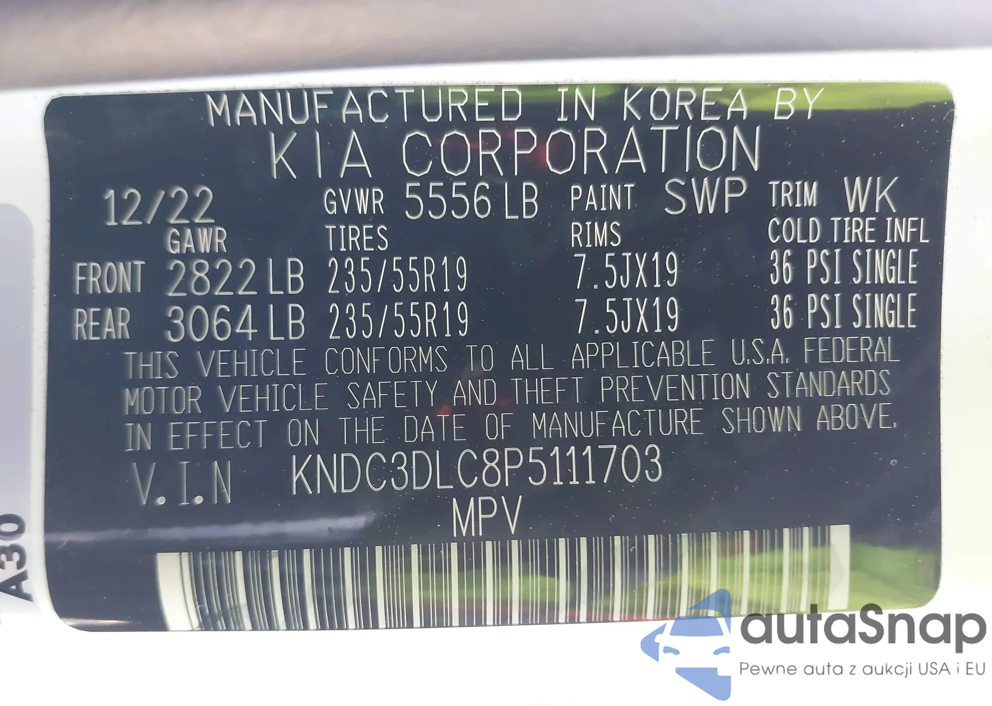 The car Kia EV6 2023 (VIN KNDC3DLC8P5111703) has not been auctioned before. The documents are clean, and the mileage matches or is below the market average. Sold by an insurance company – we recommend purchase. Delivery to the port will take approx. 6–8 weeks.