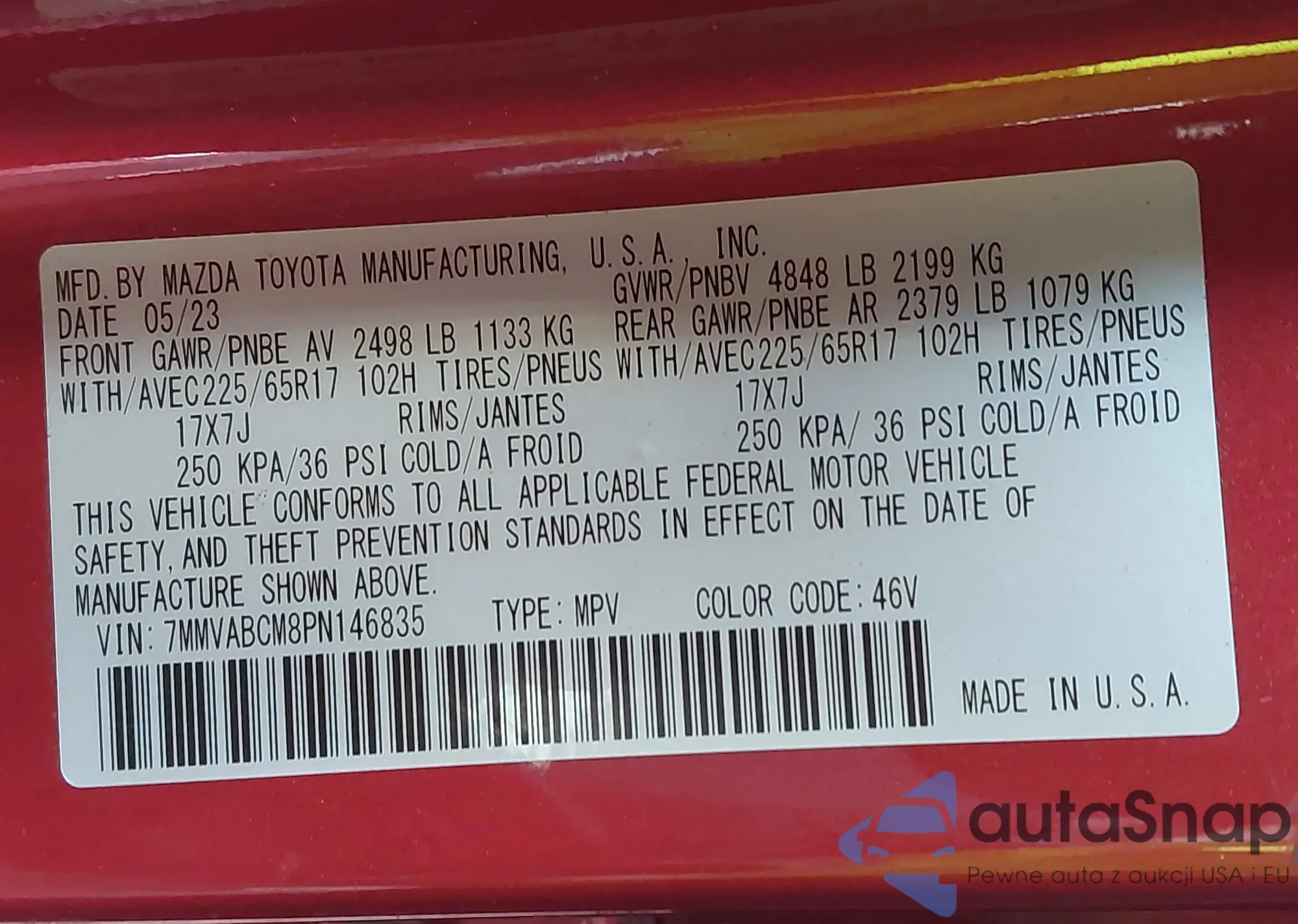 The car Mazda CX-50 2023 (VIN 7MMVABCM8PN146835) has documents that prevent registration. Export and registration may be difficult. Contact AutaSnap experts to find alternatives.