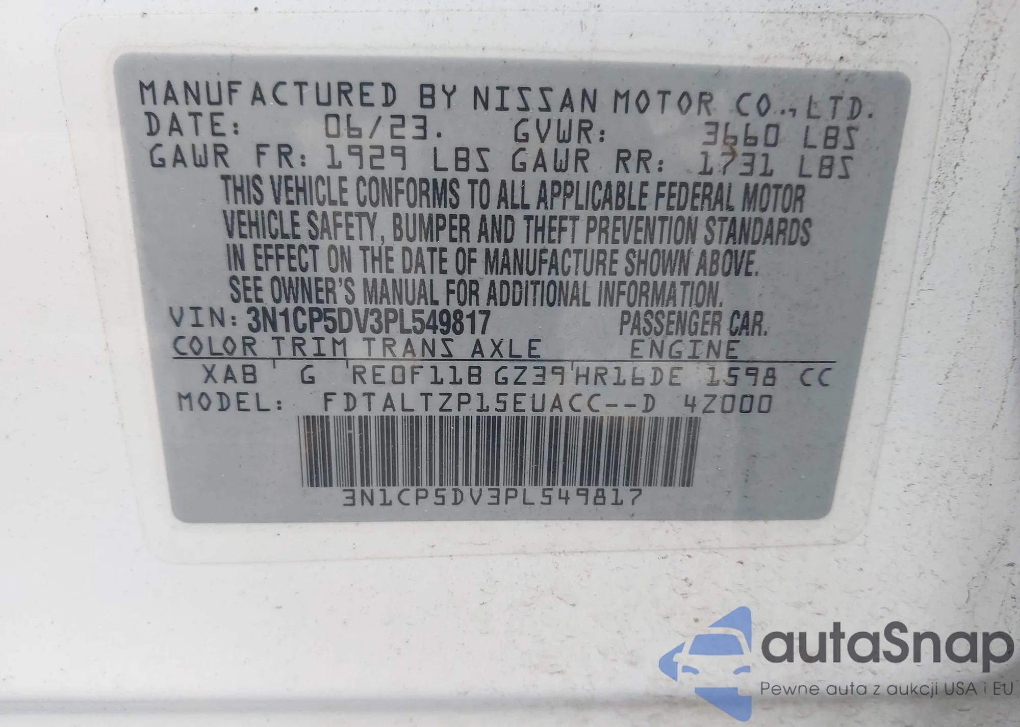VIN: 3N1CP5DV3PL549817